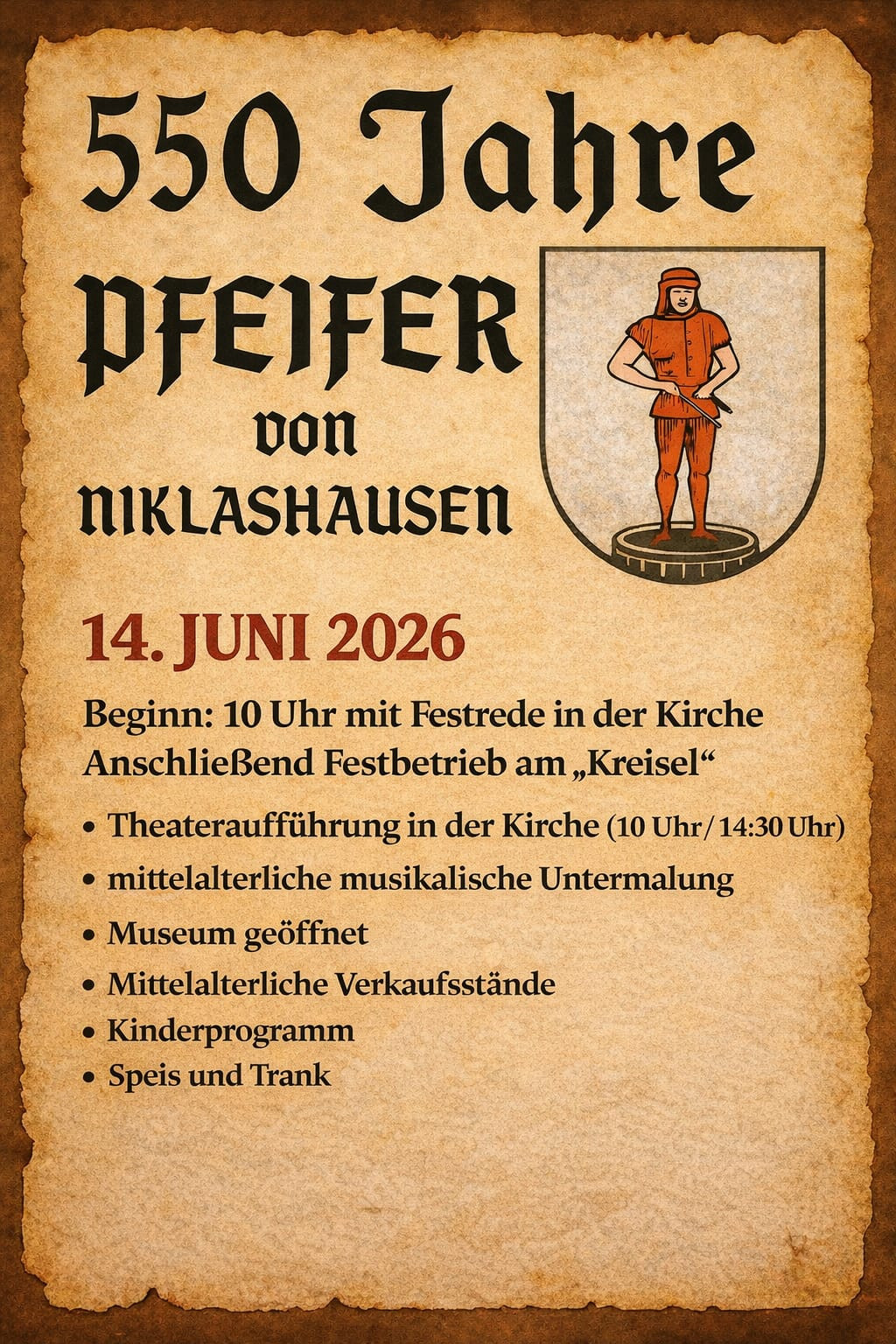 Beginn ist um 10 Uhr in der Kirche mit Festrede, Theateraufführungen, viel Musik und danach "mittelalterlicher Festbetrieb" am Kreisel an der Kirche.