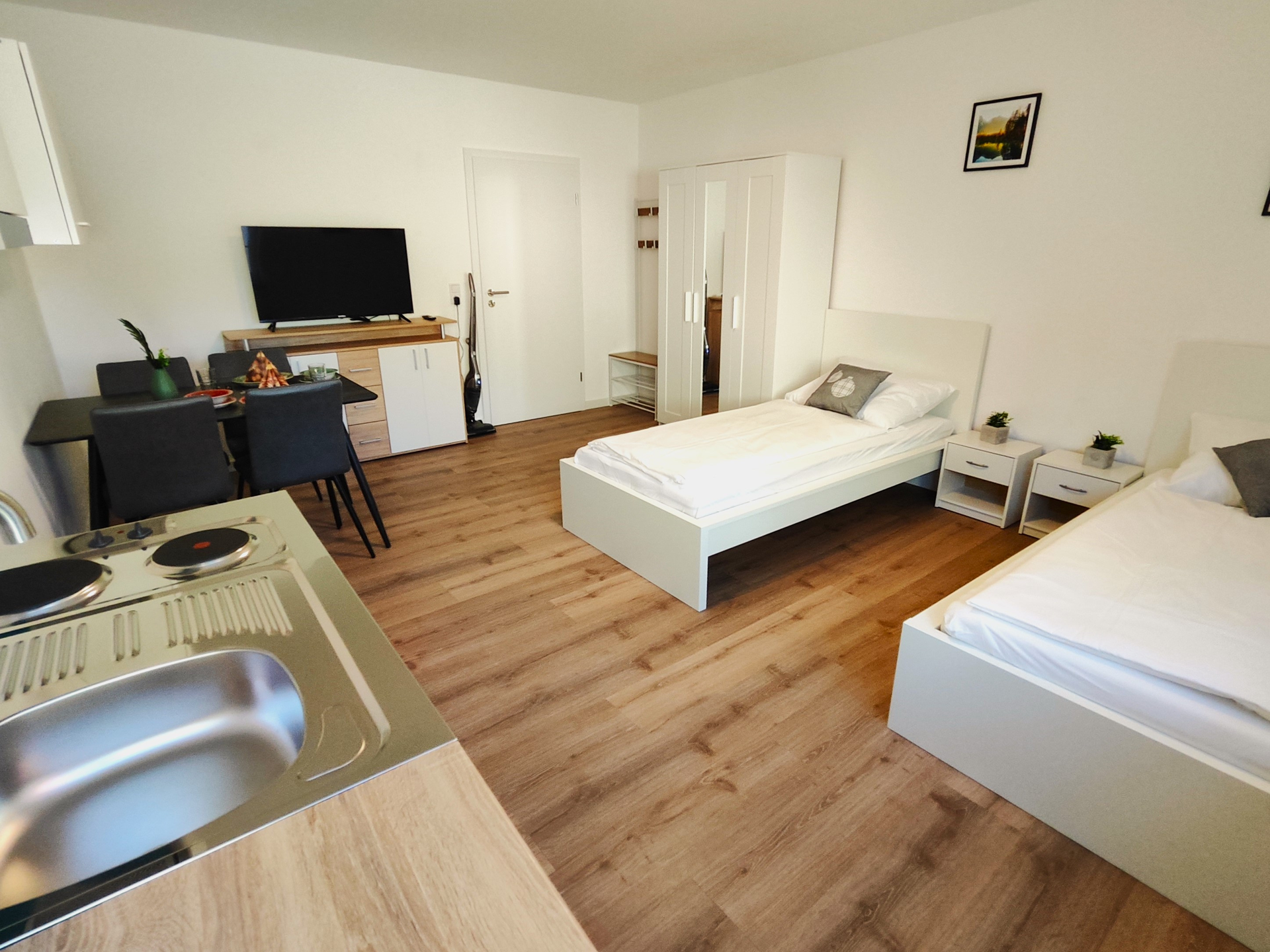 Jedes Zimmer verfügt über bequeme Einzelbetten, Esstisch mit Stühlen, Garderobe, Sideboard und einen Kleiderschrank. - Ankommen und Wohlfühlen: