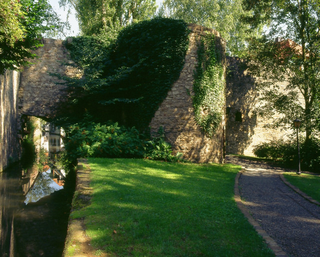 Alte Stadtmauer mit dem Hungerturm und dem Mühlkanal.