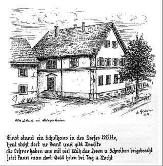 Das Schulhaus stand gegenüber dem Pfarrhaus zwischen dem Rathaus und dem Gasthaus zur Kanne. Dieses wurde 1852 wegen Baufälligkeit verkauft, nachdem 1851 im Dorfkern, dort, wo sich heute die Bank befindet, die „Alte Schule" erbaut worden war. Diese Schule hatte zwei Klassenzimmer und im zweiten Stock zwei Lehrerwohnungen. Später wurde das Gebäude durch einen Anbau um drei Klassenzimmer erweitert. Dieses Schulgebäude genügte über ein Jahrhundert, da die Einwohner- und Schülerzahl ziemlich konstant blieb.