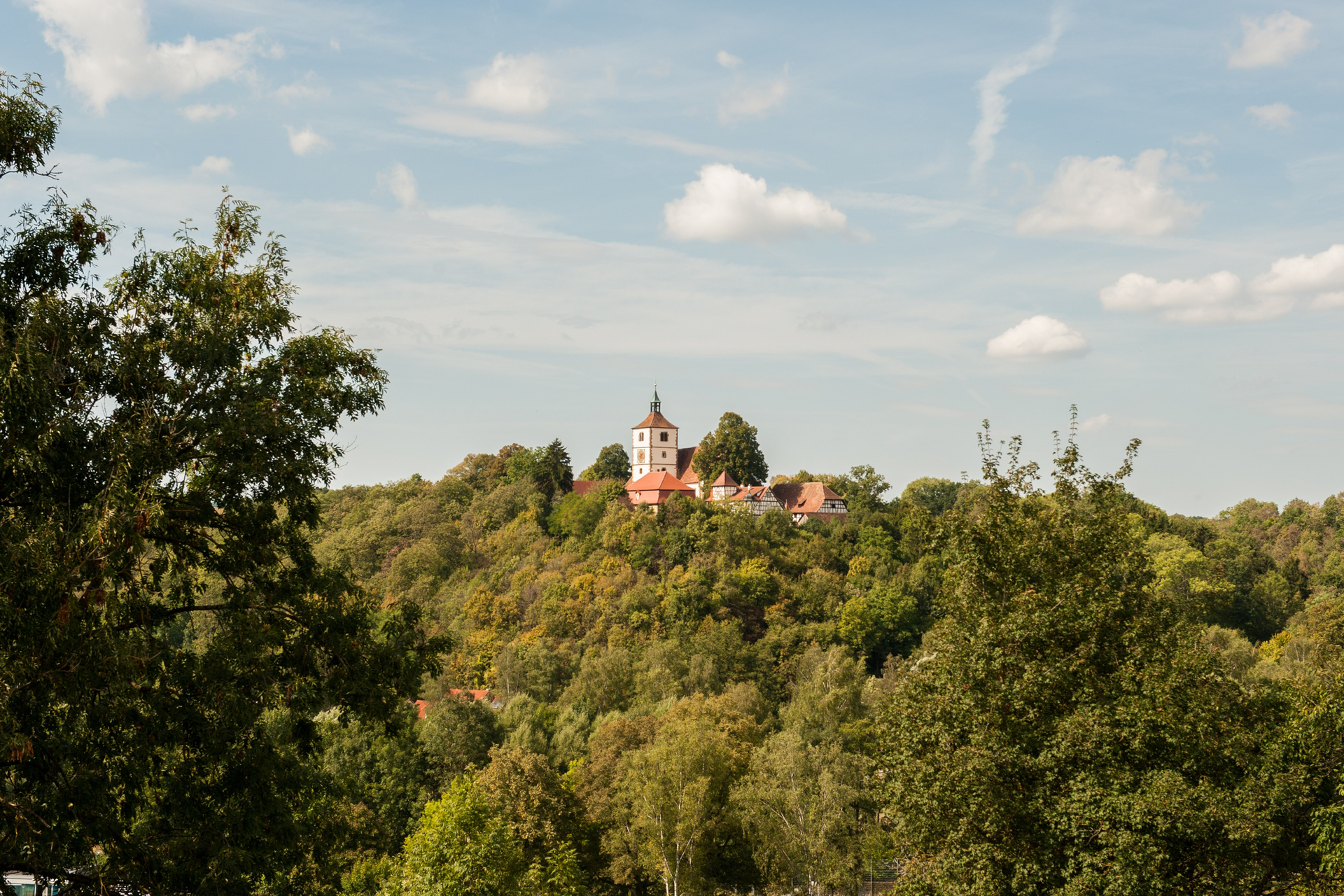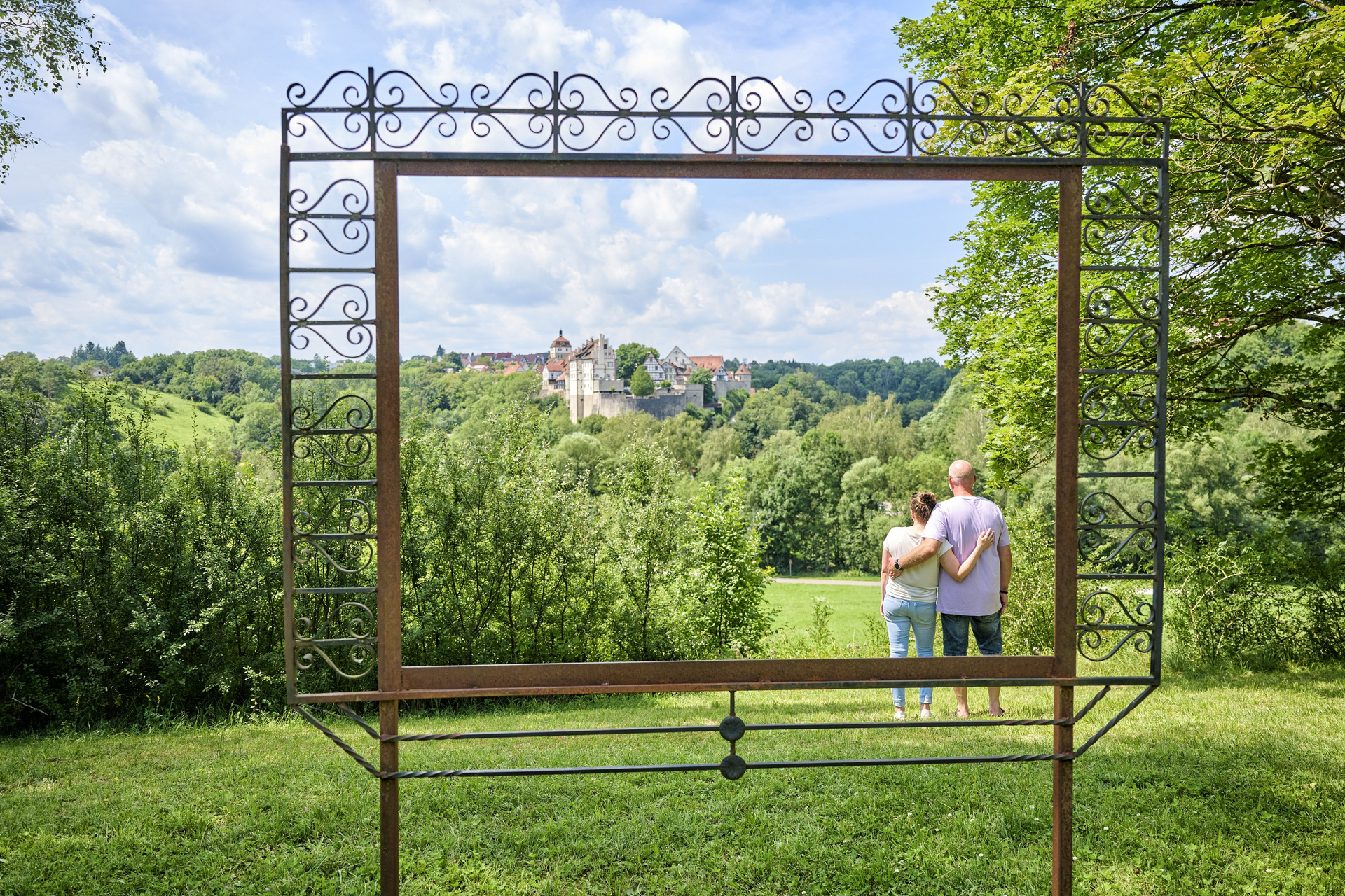 Von diesem Aussichtspunkt genießt du einen traumhaften Panoramablick auf die malerische Fachwerkkulisse von Vellberg. Vor dir liegen die historischen Festungsmauern des Unteren Schlosses, daneben ragt die St. Martinskirche auf der Stöckenburg empor – und der Blick schweift über das idyllische Bühlertal.