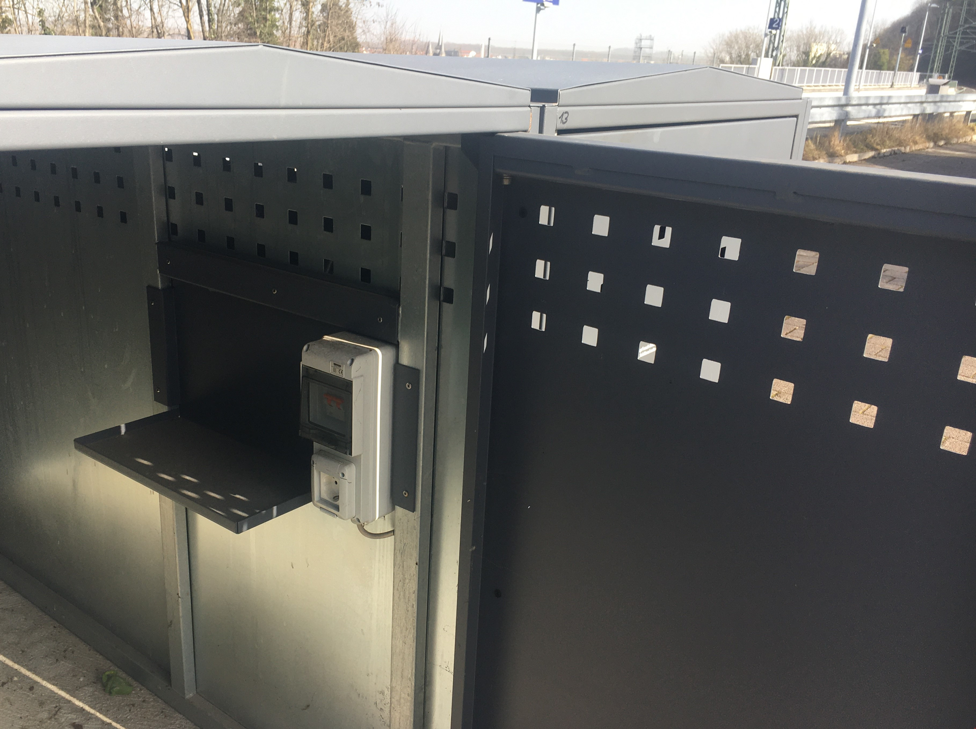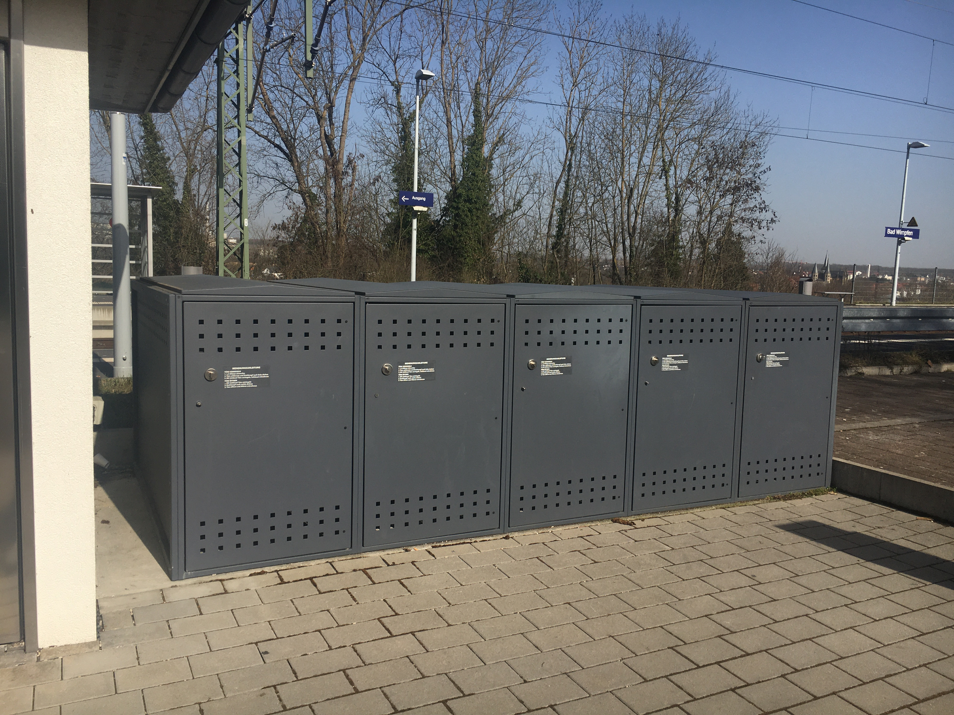 Abschließbare Fahrradboxen mit E-Bike-Lademöglichkeit am Bahnhof Bad Wimpfen.