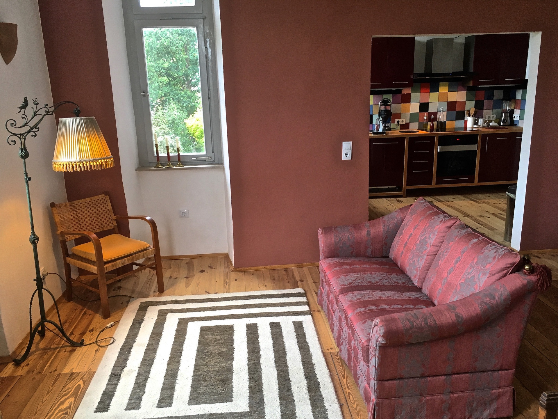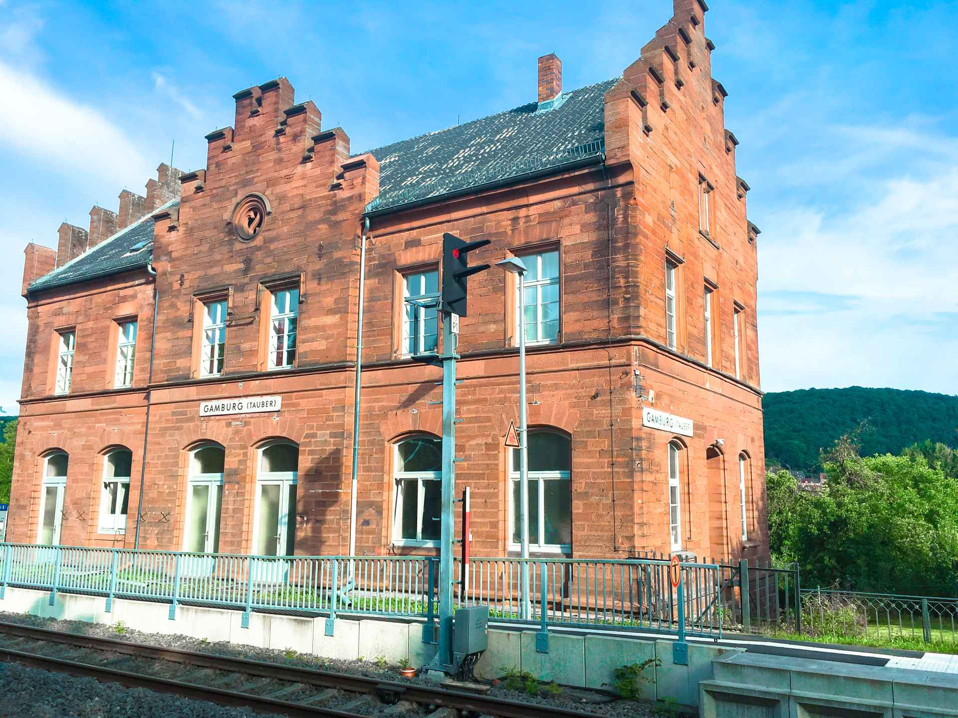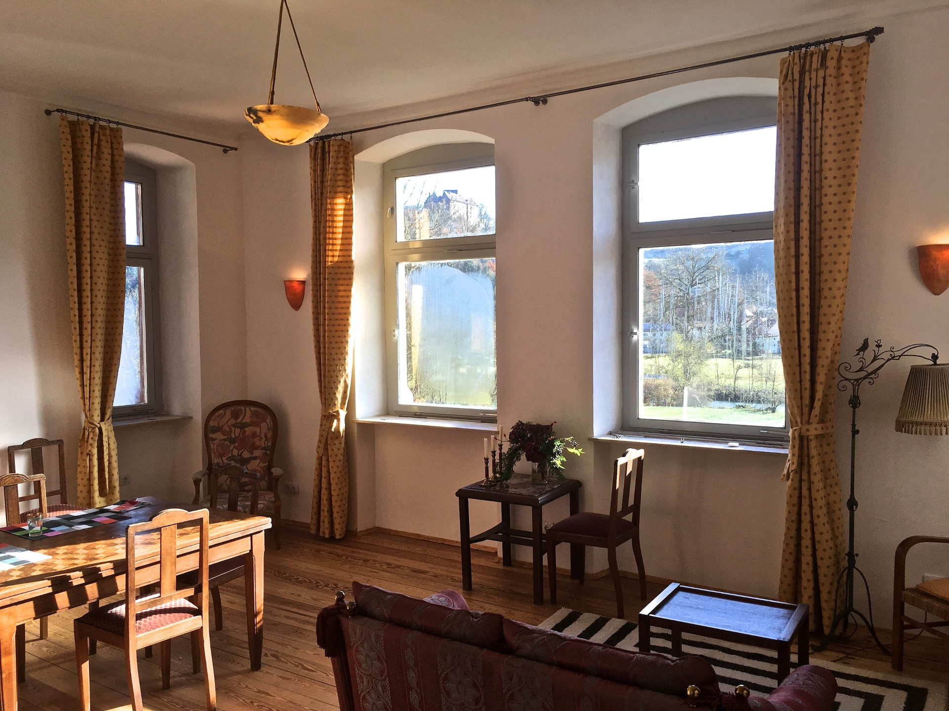 Riesige sonnige Wohnung im historischen Bahnhof Gamburg mit Blick auf Tauber und Burg Gamburg. Komfortable Küche, 2 Bäder, Gäste-WC. Garten. Alleinlage!