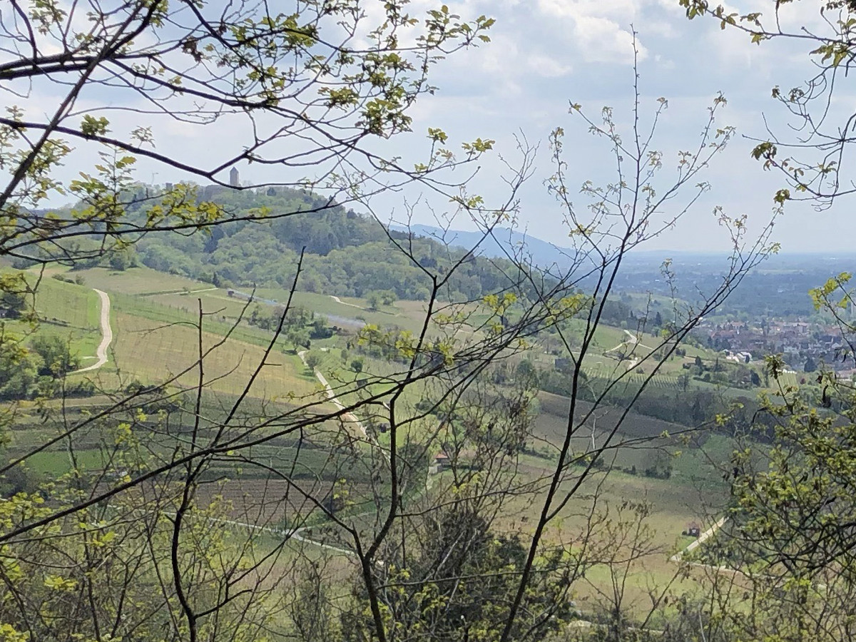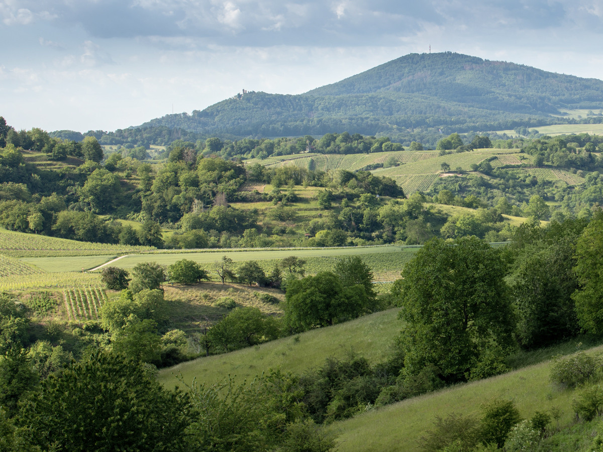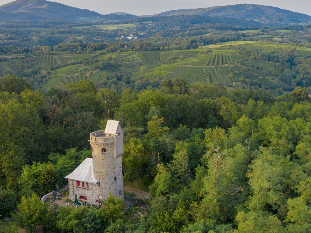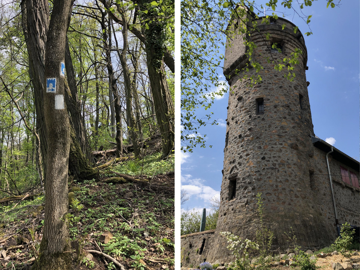 In der Nähe der Hahnmühle geht es über eine Brücke und dann steil hinauf zum Hemsberg. Dort bietet sonntags der Blick vom Bismarckturm eine tolle Rundumsicht. Sein Wirt hält regionale Kleinigkeiten zum Essen und Trinken bereit. Die Schutzhütte für Wanderer ist täglich zugänglich. Am Rande des Naturschutzgebietes geht der Burgensteig talwärts. Über Wiesen, Felder und durch Weinberge mit vielen Rastplätzen gelangt man nach Hambach.