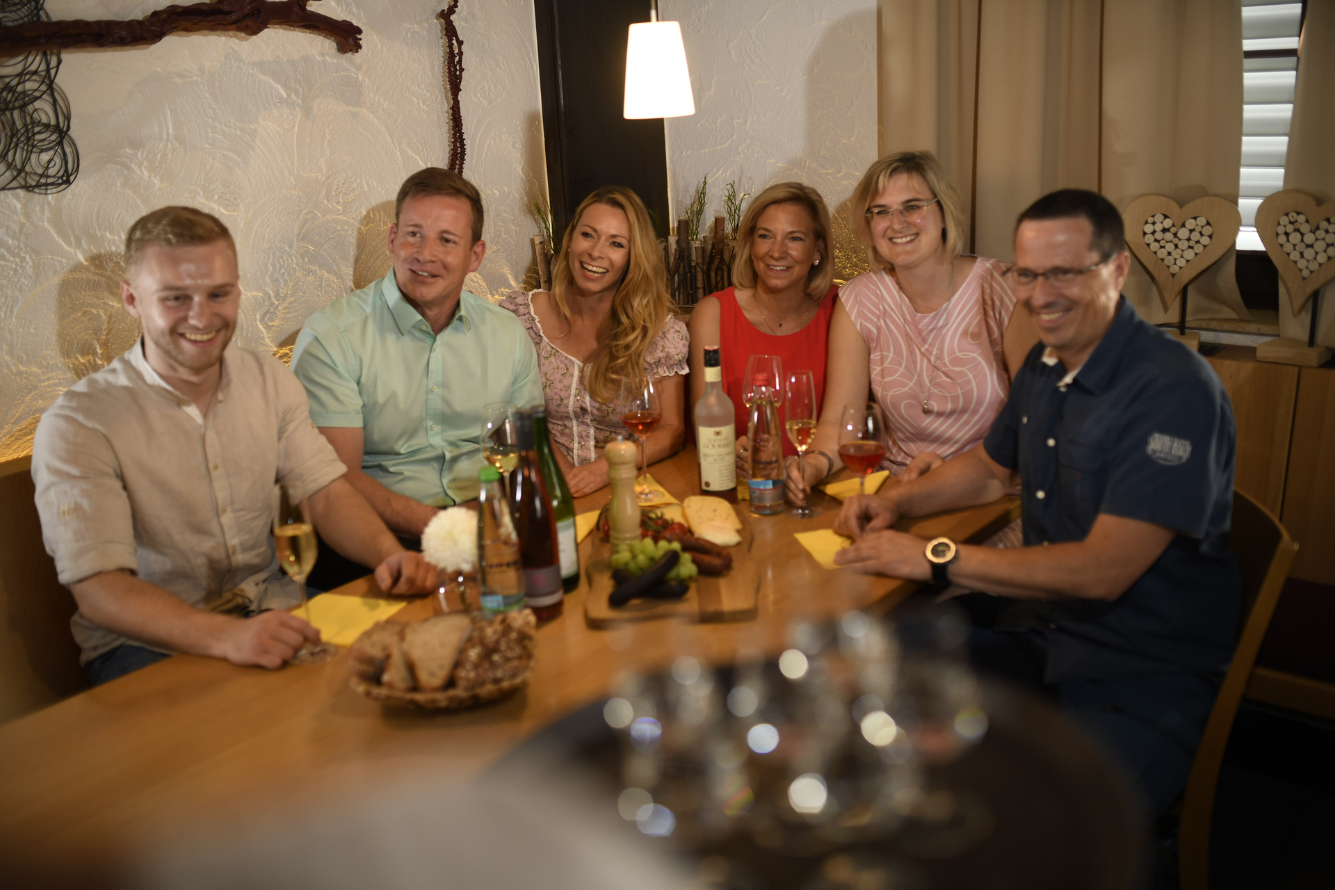 Die Stimmung ist wie früher, hier trifft man die Einheimischen. Bietet das Weingut auch seine „Wein-erleben-Tour“ an. Nach einer kurzen Fahrt mit dem Planwagen in die Weinberge geht es ein Stück zu Fuß weiter bis zum aussichtsreichen Weinterrasse, wo die gesellige Weinprobe stattfindet.