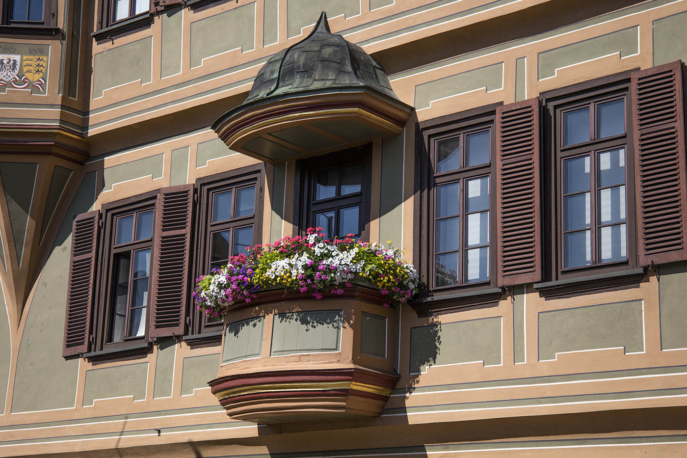 ab 1780 verputzt und bemalt. EG: offene Markthalle, 1. OG: Festsaal, 2. OG: Gerichts- und Ratsstuben, heute Büros der Stadtverwaltung u. a. des Oberbürgermeisters.