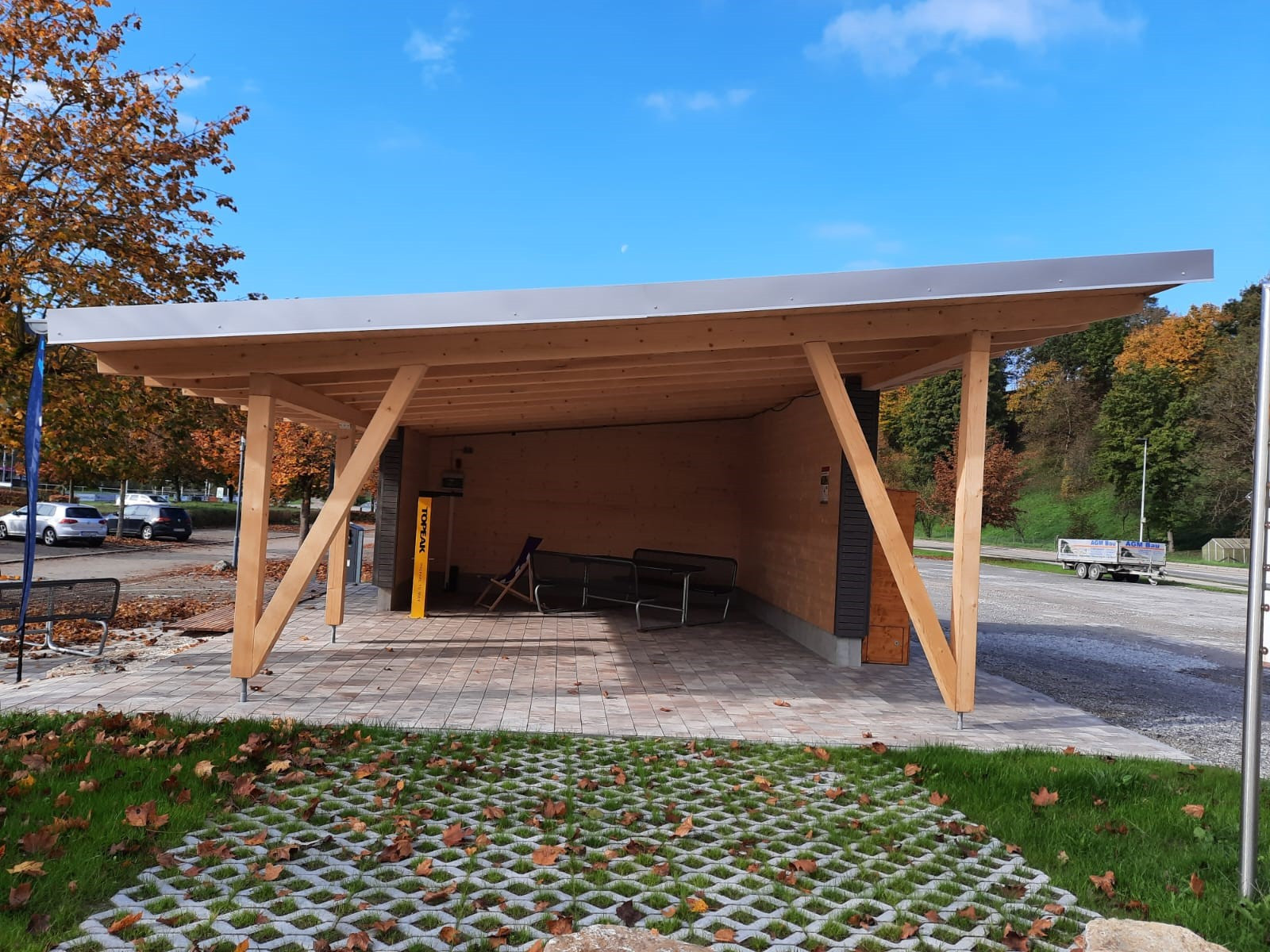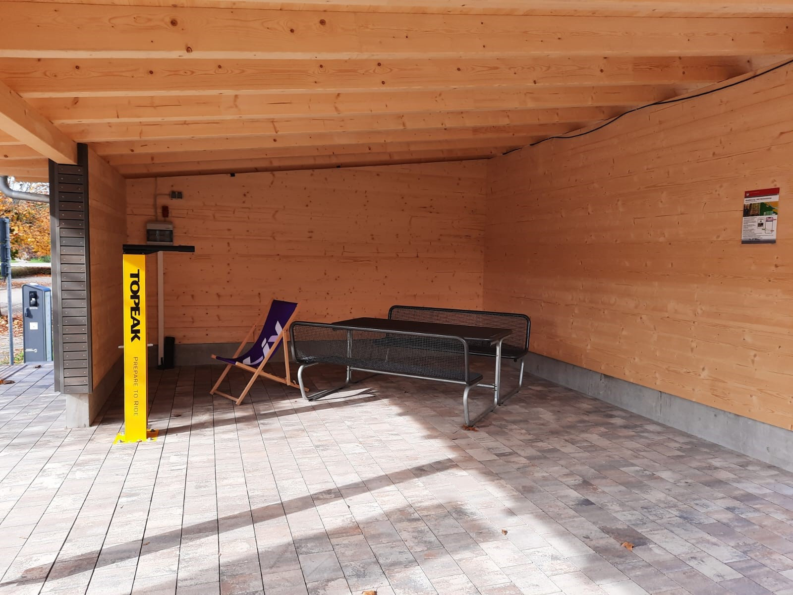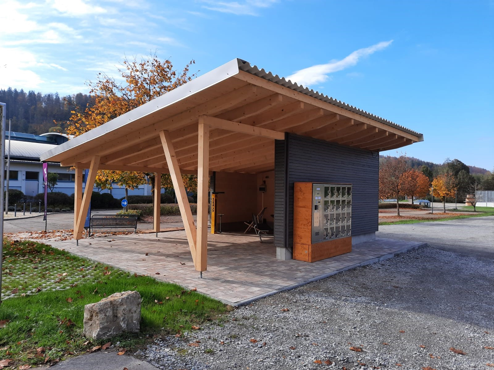 Die Holzkonstruktion schützt vor Wind und Wetter, während zwei Sitzbänke zum Verweilen einladen.
