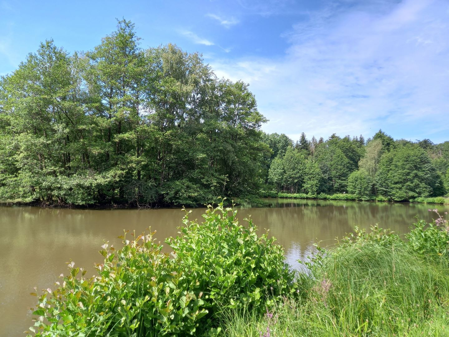 Gleich hinter dem Fischteich zweigt die längere Wegvariante - über den Kirgel - nach rechts ab. (Die kürzere Wegvariante verläuft geradeaus weiter über Kleinaltdorf zurück zum Ausgangspunkt.)