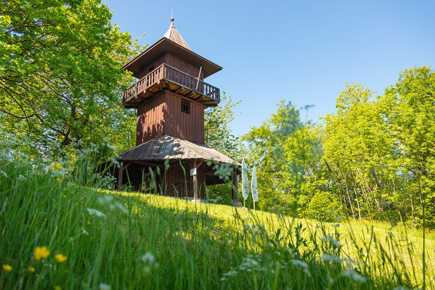 Wer einen kurzen Abstecher zum Turm machen möchte, der wartet, bis der Wanderweg nach ca. 600 m wieder auf den Forstweg trifft und biegt in diesen ein. Nach ca. 200 Metern ist dann der Kernerturm erreicht. Von Ostern bis in den Oktober ist der Turm an Sonn- und Feiertagen geöffnet.