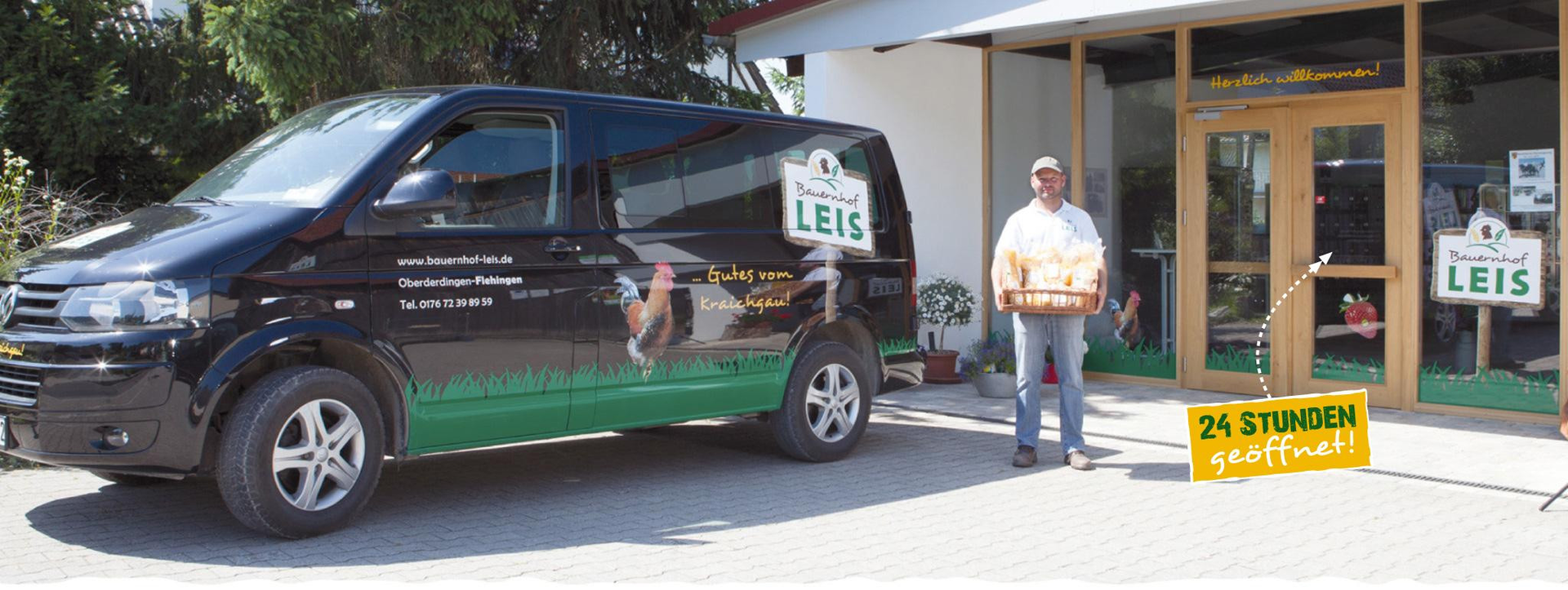 Eigene Bio-Eier aus unseren kleinen Mobilställen, eigene kalt gepresste Bio-Öle aus unserer Bio-Öl-Manufaktur, eigener Streuobstwiesen-Apfelsaft, Flehinger Bio Rapshonig, Kartoffeln, Zwiebeln, Karotten, Äpfel, Milchprodukte, Marmeladen, Mehle, Dosenwurst, Hühnersuppe, Bruderhahn-Bolognese, Eierlikör, Nudeln, Süßwaren und Knabbereien.