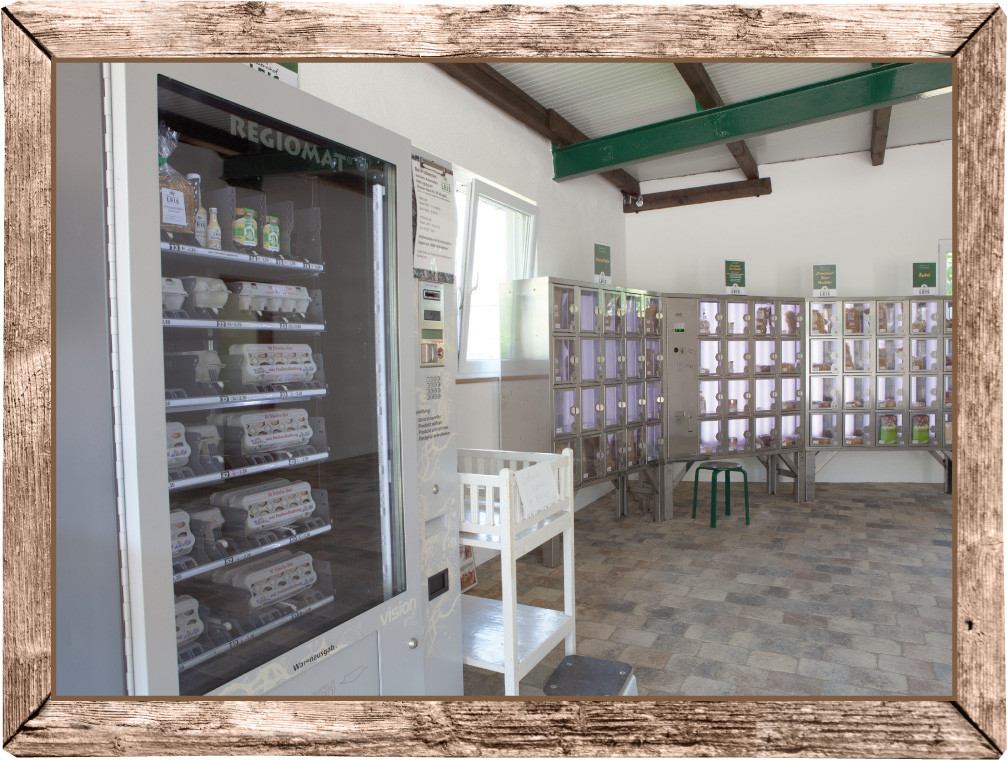 Vier moderne, gekühlte Verkaufsautomaten halten eine breite Palette eigener und regionaler Produkte bereit.