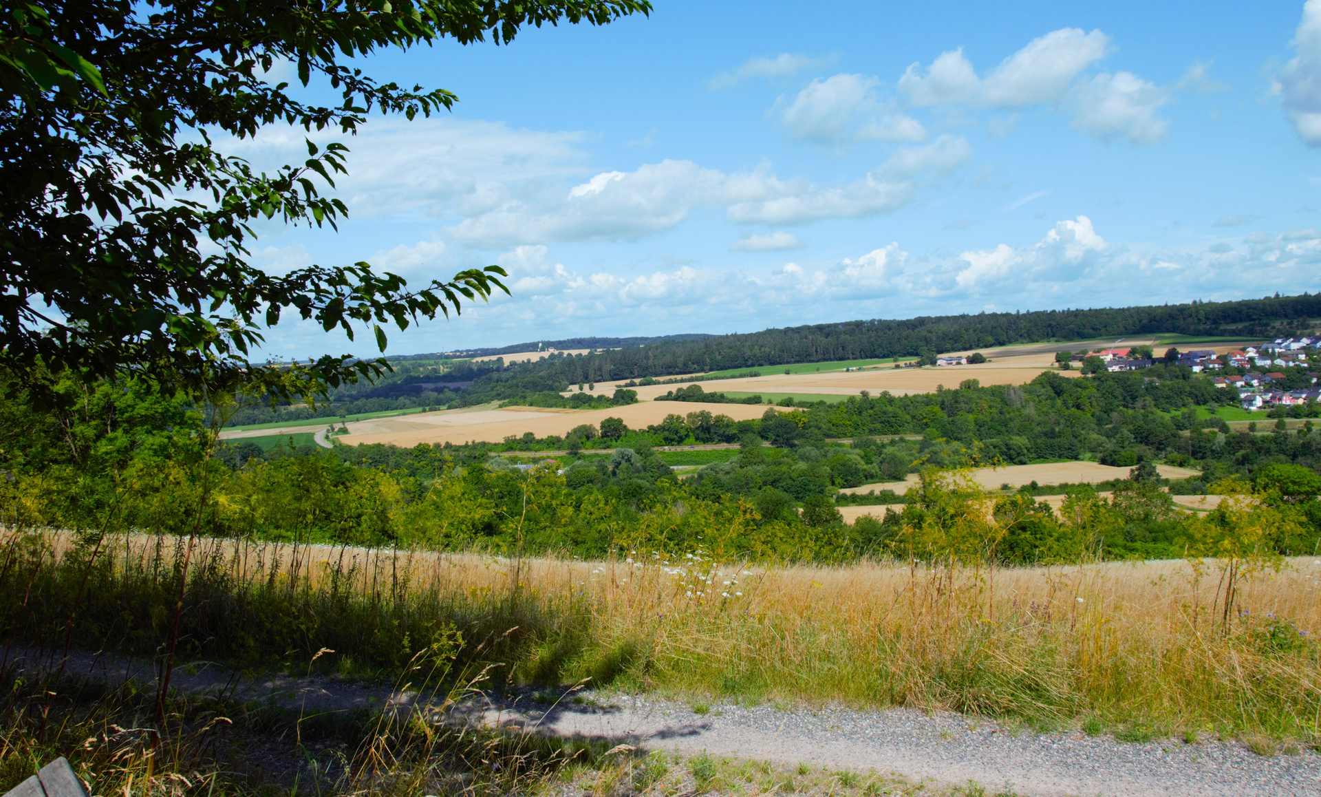 Vom Startpunkt aus läuft die Tour über Wiesen und Felder oberhalb von Neudenau-Herbolzheim.
