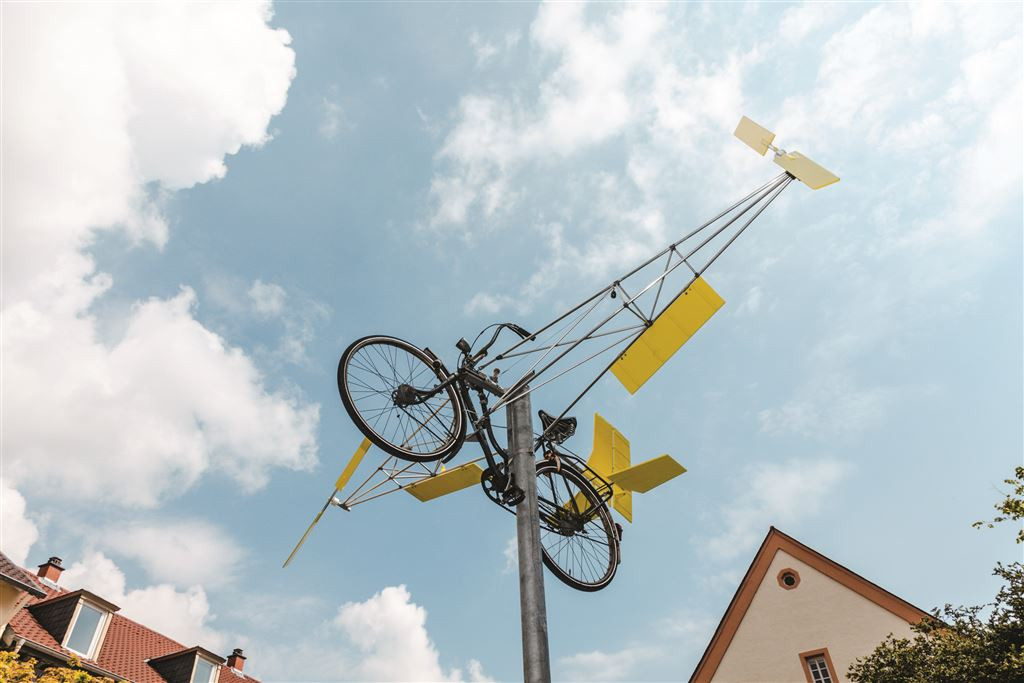 Der Kieler Künstler Björn Schülke präsentiert sein Objekt am Ortseingang von Schwetzingen. Sein Luftrad ist hoch oben auf einer grazilen Edelstahlstange befestigt. Durch die Anbringung eines Höhenruders, von Tragflächen mit Landeklappen und Propellern gibt das Readymade vor, ein funktionierendes Flugobjekt auf Fahrradbasis zu sein. Hierbei legt Schülke eine Finte, denn bei den Tragflächen handelt es sich um luftdurchlässige Gestänge, das Objekt ist folglich flugunfähig!Hinweis: Das Objekt befindet sich aktuell nicht im öffentlichen Raum.