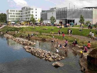 Ob Studentenwohnen, Reihen- oder Penthouse – die Bruchsaler Bahnstadt rund um den großen Quartiersplatz ist vielfältig und bietet modernes und effizientes Wohnen. Mehr als tausend Bürger haben hier entlang der Saalbach bisher ein neues Zuhause gefunden. An Freitreppen erinnernde gestufte Uferbereiche und ein weitläufiges Gelände bieten Struktur und Raum auch für größere Veranstaltungen.