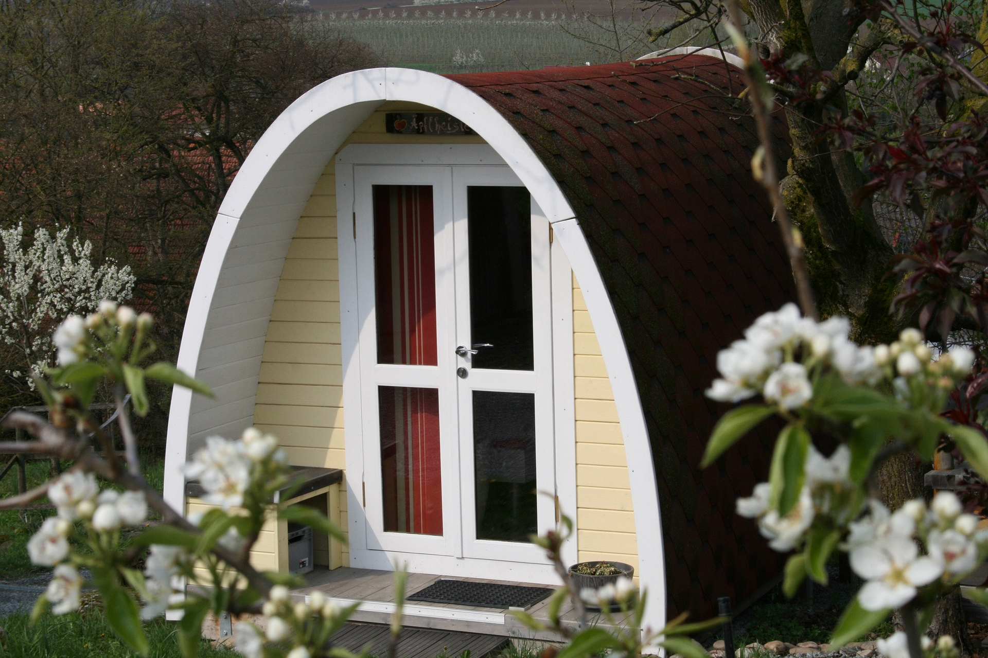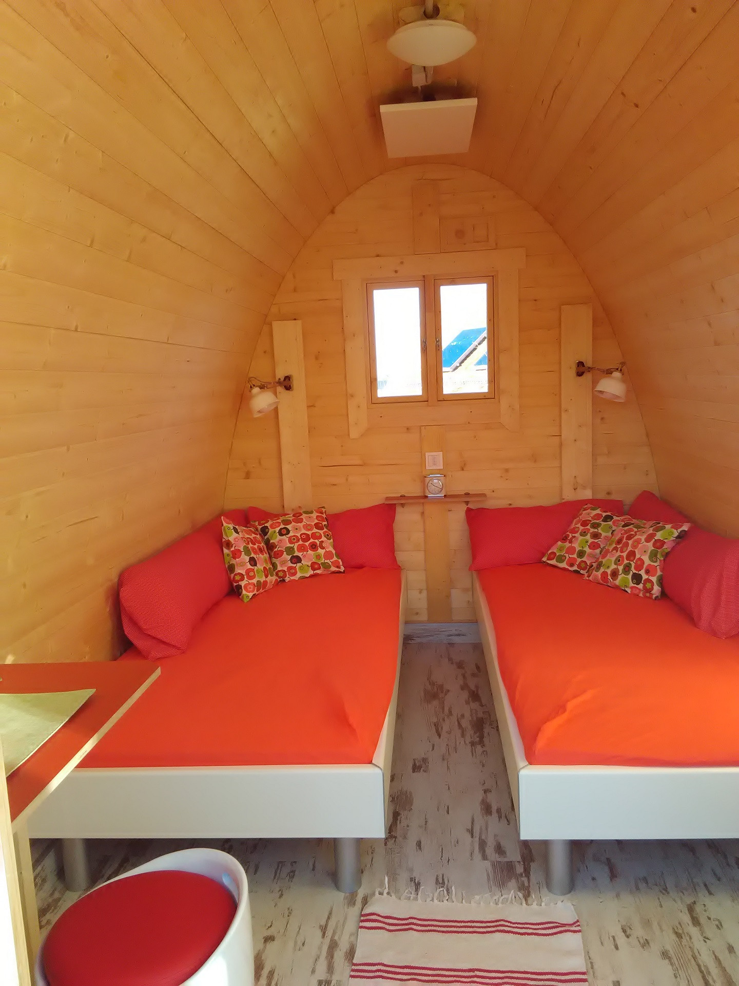Zwei halbrunde Holzhütten aus skandinavischer Fichte bieten dir im minimalistischen Design Komfort. Ausgestattet sind sie mit zwei gemütlichen Betten, einer Sitzgelegenheit und Infrarotheizung für kühle Tage.