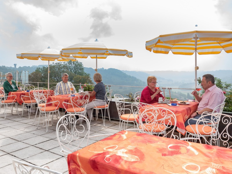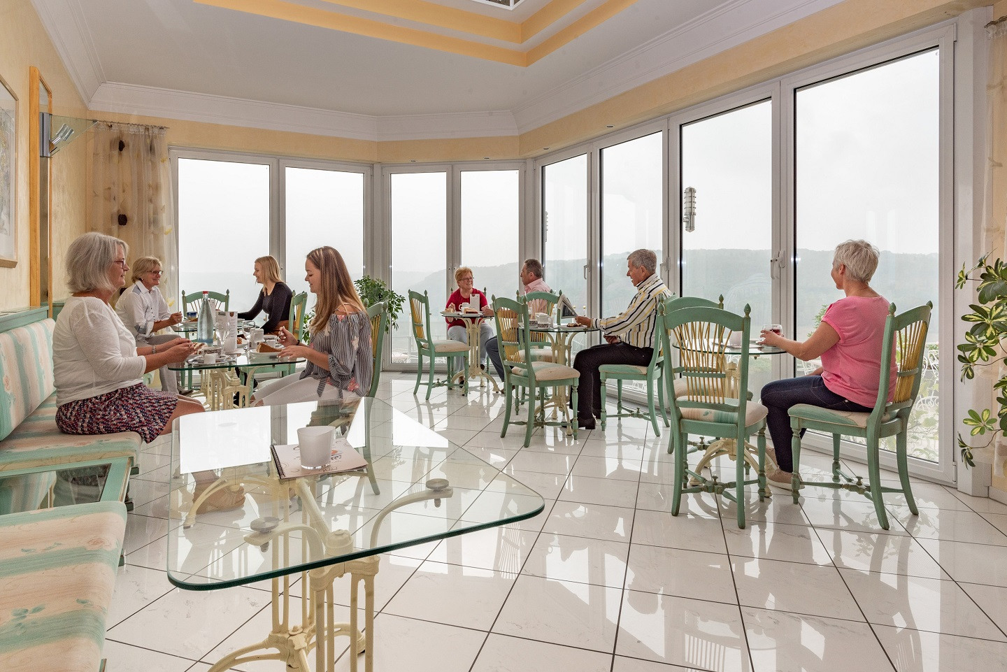 Hoch oben über dem Jagsttal begrüßt das Café Bauer seine Gäste.