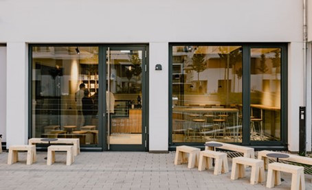 Das iaro im Kompass Quartier Bruchsal bietet eine harmonische Mischung aus Schlichtheit und Eleganz. Das Herzstück des Cafés ist das beeindruckende Atrium, das ein einzigartiges Großstadtflair erzeugt und zeitgleich eine Oase der Ruhe darstellt.