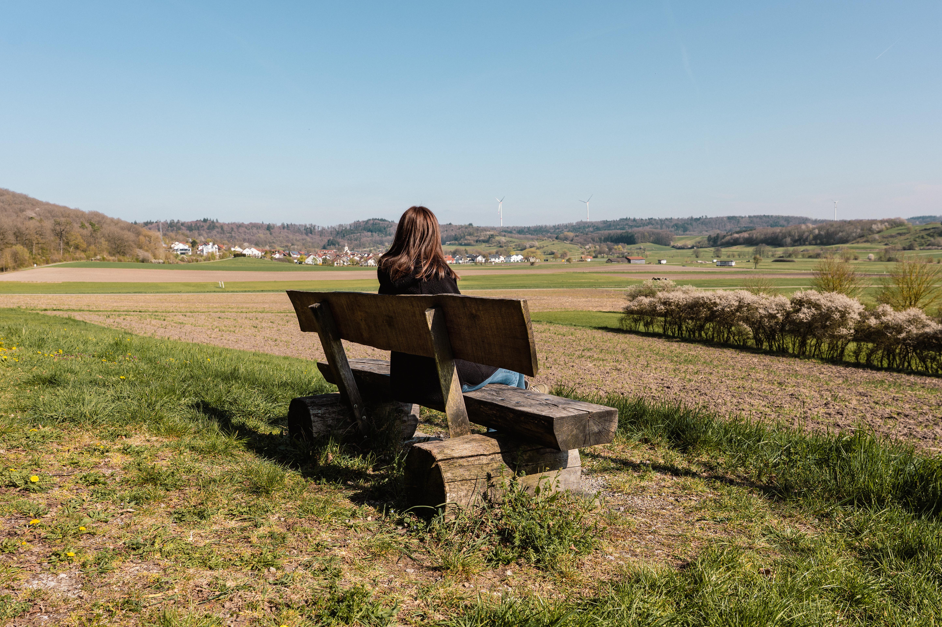 Am Waldrand trittst du aus dem Wald heraus – ein wunderschöner Ausblick auf Goldbach und in der Ferne auf Crailsheim erwartet dich. Zwei Holzbänke und ein Gedenkstein laden hier zu einer Pause ein.