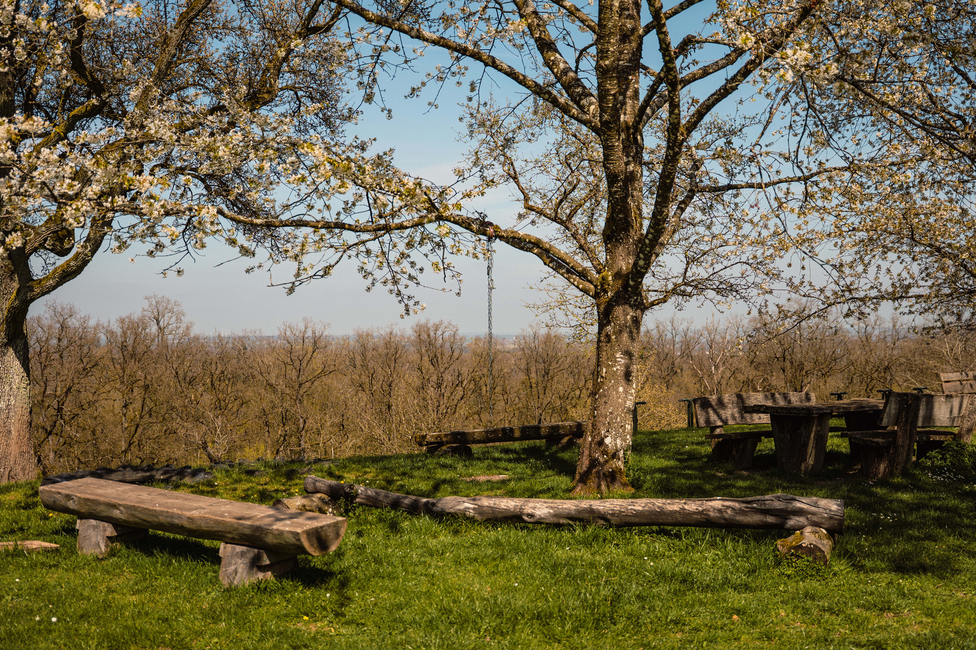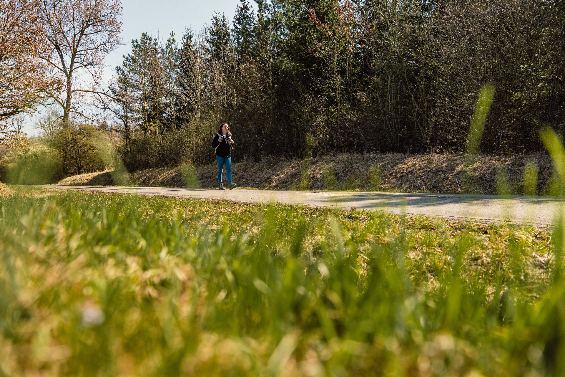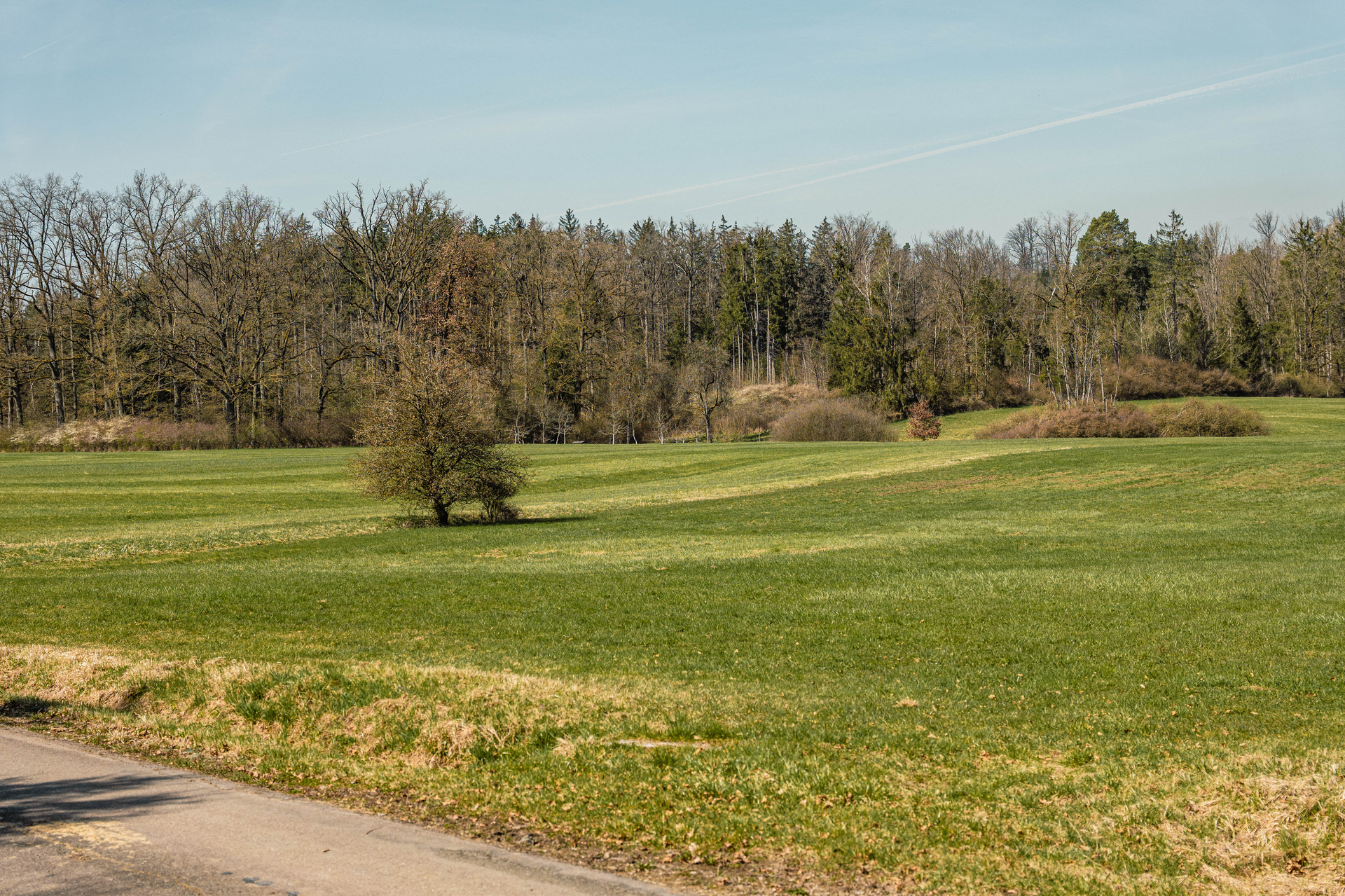 Nach etwa 200 Metern kannst du links abbiegen und überquerst das Aspenbächle. Kurz danach erreichst du die ersten Häuser des Neubaugebiets. Etwas versteckt zweigt hier rechts ein Wiesenpfad ab. Folge ihm vorbei an Streuobstwiesen und Holzlagern, bis Du auf einen befestigten Weg stößt. Halte dich halb rechts bis zum Waldrand. Hier geht es scharf links bergauf. Oben angekommen triffst du auf einen Querweg – folge ihm nach rechts. Du wanderst weiter geradeaus, leicht ansteigend, bis du aus dem Wald hinaustrittst. Wieder auf einem Weg am Waldrand geht es rechts weiter, bis zu einer markanten Kreuzung mit einem baumbestandenen Dreieck in der Mitte.