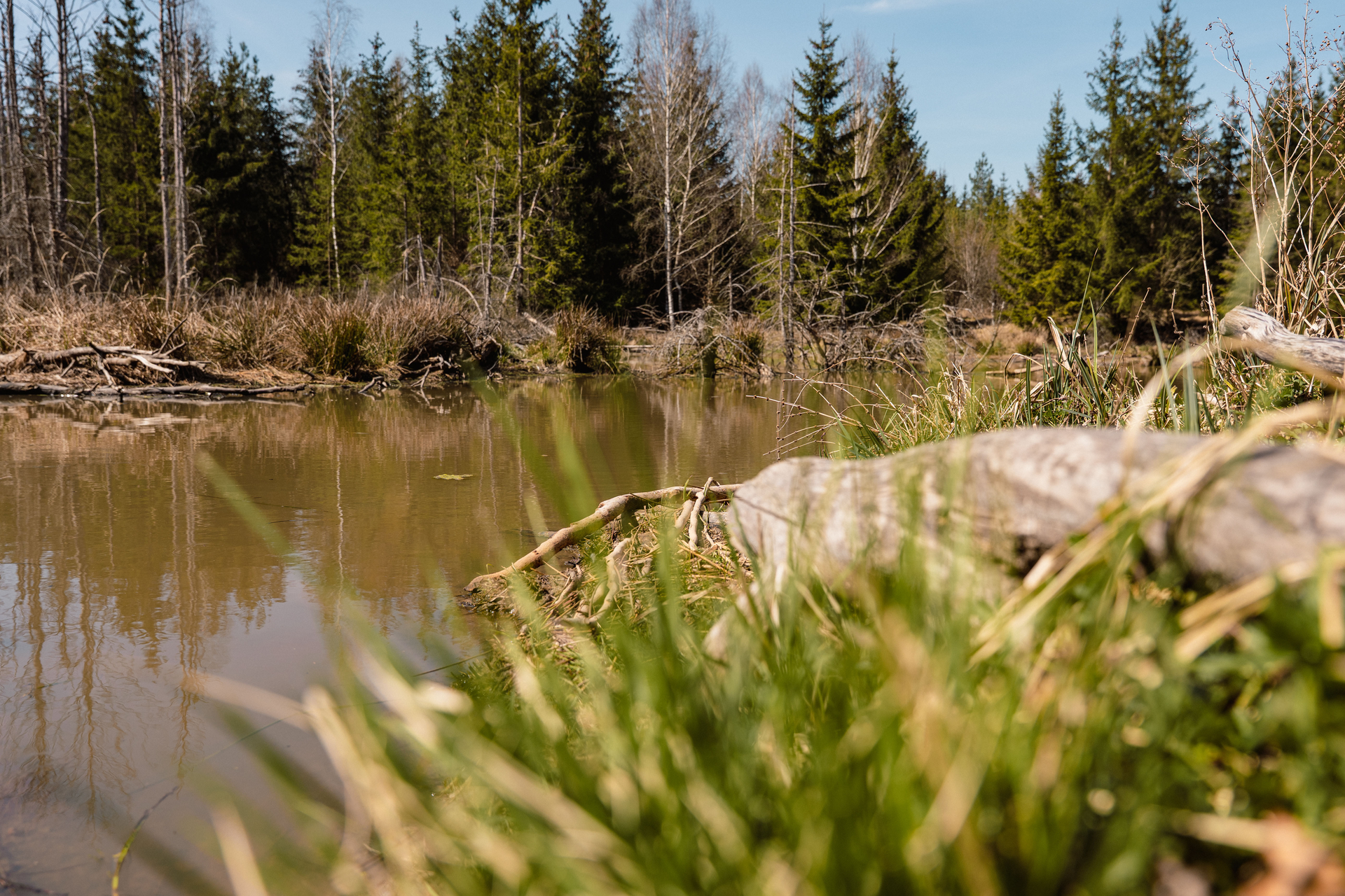 Am Wegedreieck folgst du dem befestigten Weg nach rechts, überquerst eine weitere Kreuzung und wanderst nach rund 300 Metern an kleineren Abzweigungen vorbei – immer auf dem Hauptweg (H4-Markierung). Es geht leicht bergab in eine Linkskurve, an kleinen Seen vorbei. Vielleicht entdeckst Du Spuren eines Bibers!