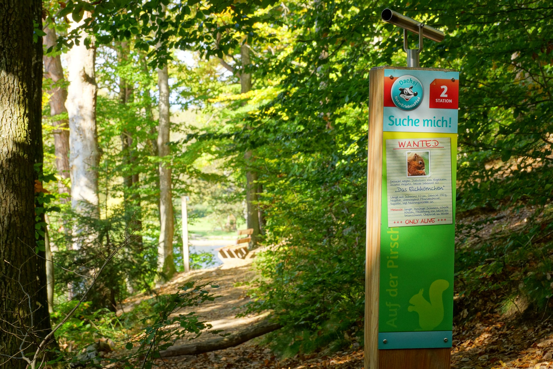 Der 2,6 km lange Rundweg verläuft auf einer abwechslungsreichen Strecke durch Wiesen, Wald, entlang des Dachsbachs und dem Finsterroter See.