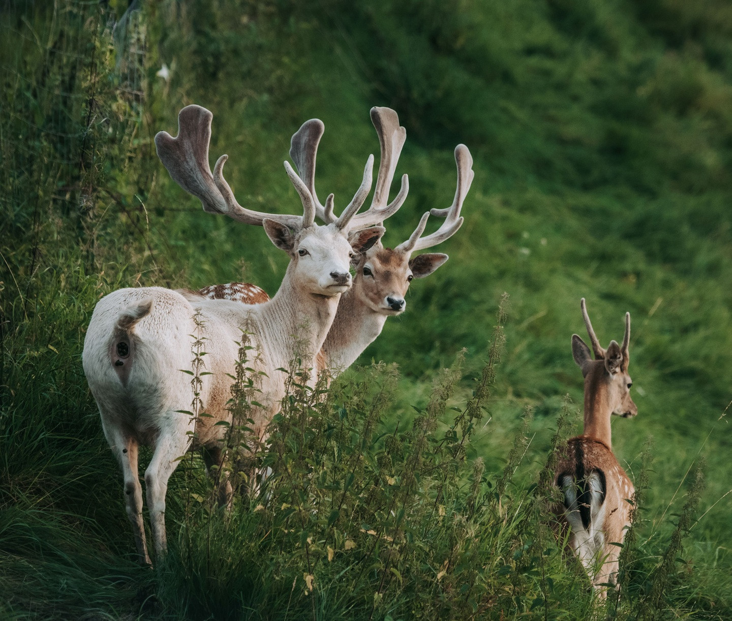 Das Damwild im Gehege ernährt sich vom Grasaufwuchs aus dem Gatter und aus selbst erzeugtem Heu und Grassilage.