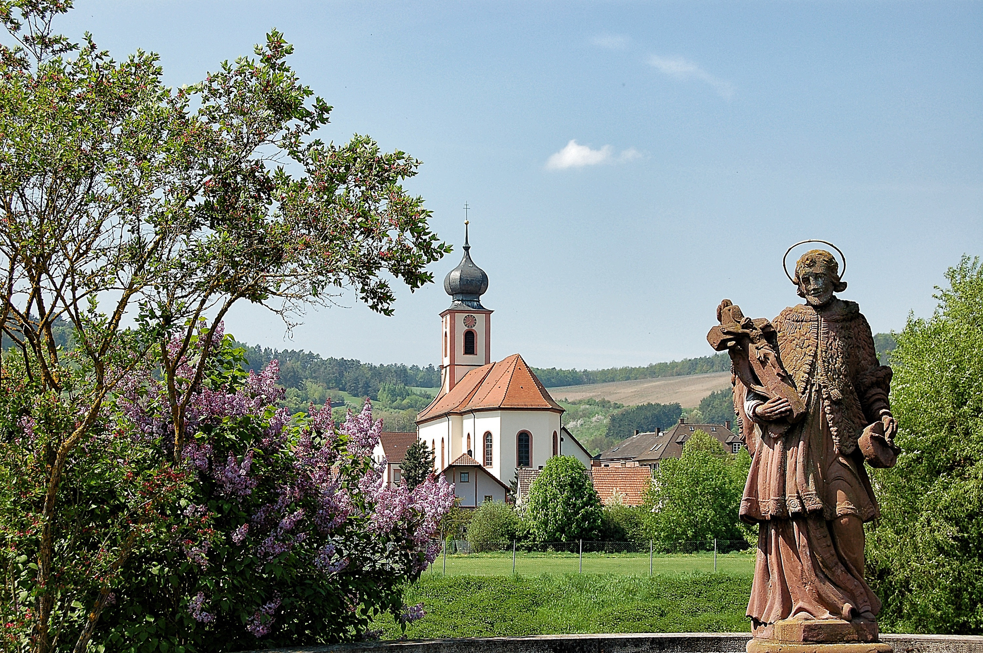 - Die Kirche St. Veit ist seit 1344 urkundlich bezeugt. Deren mittelalterliche Vorgängerkirche aus dem 11./12. Jahrhundert war eine romanische Pfeilerbasilika mit Apsis und Vierungsturm. Von 1748 bis 1752 wurde die Kirche nach Plänen von Balthasar Neumann neu erbaut. Das Innere ist im angehenden Rokoko ausgestattet. Die Gemälde sind von dem Würzburger Maler Michael Wölcker; auch Kanzel, Gestühl und Orgel sind treffliche arbeiten im Rokokostil.