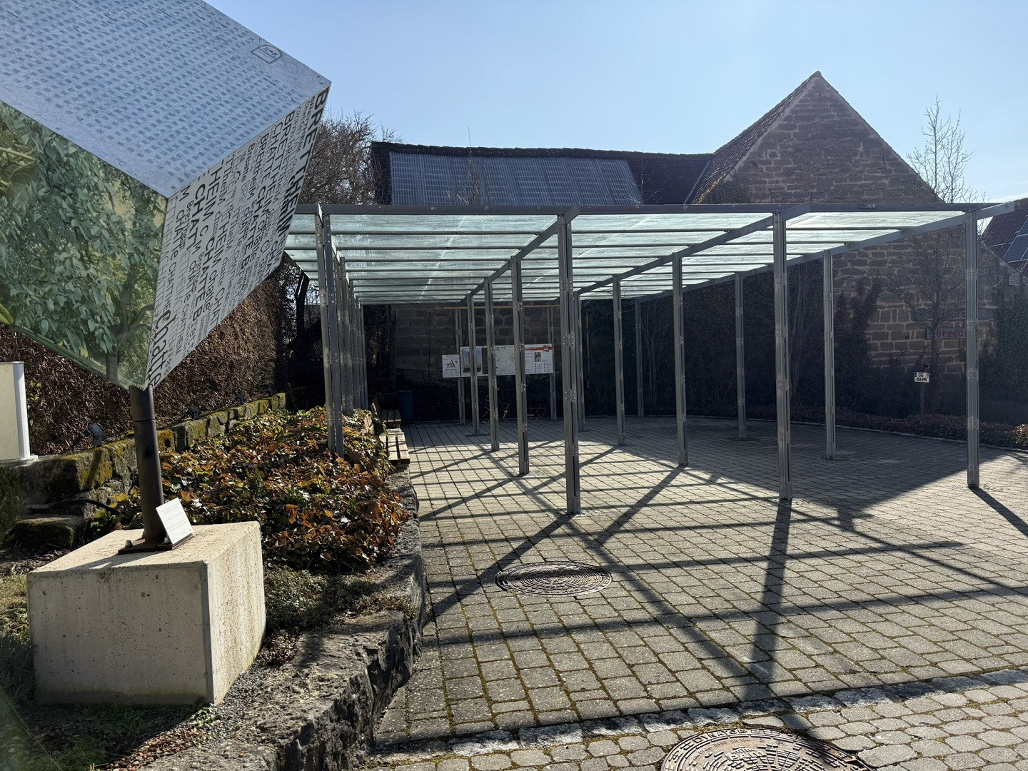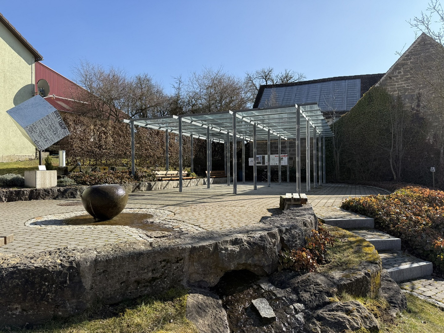 Dorfplatz Brettheim mit Sitzgelegenheiten, Hinweistafeln und Brunnen. Teilweise überdacht, kein Abfallbehältnis vorhanden.