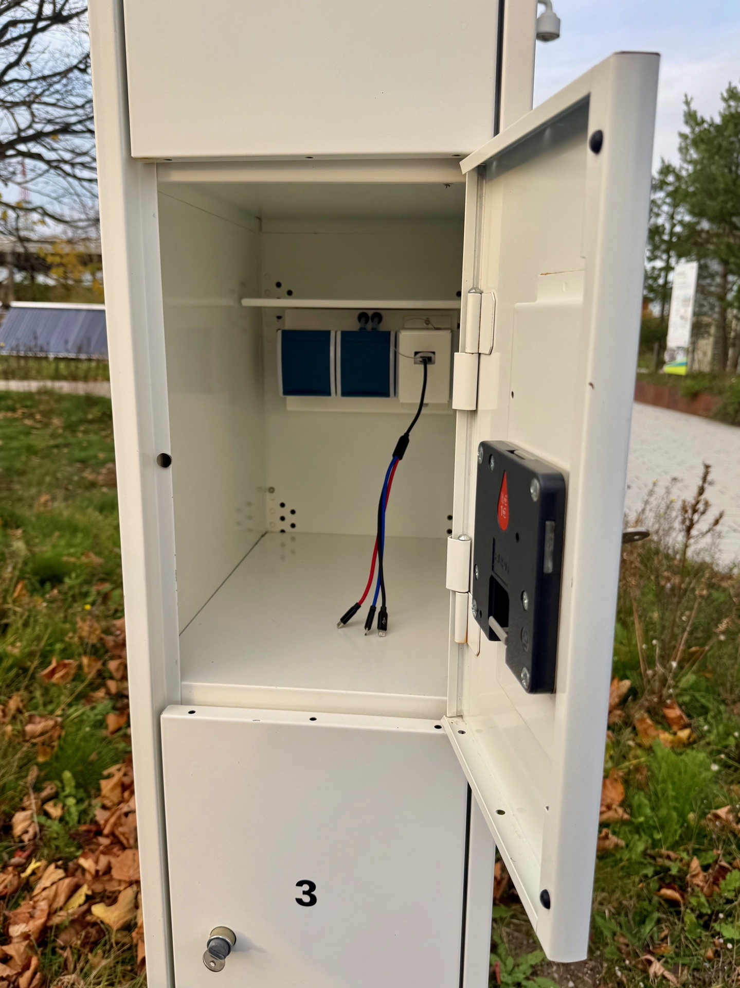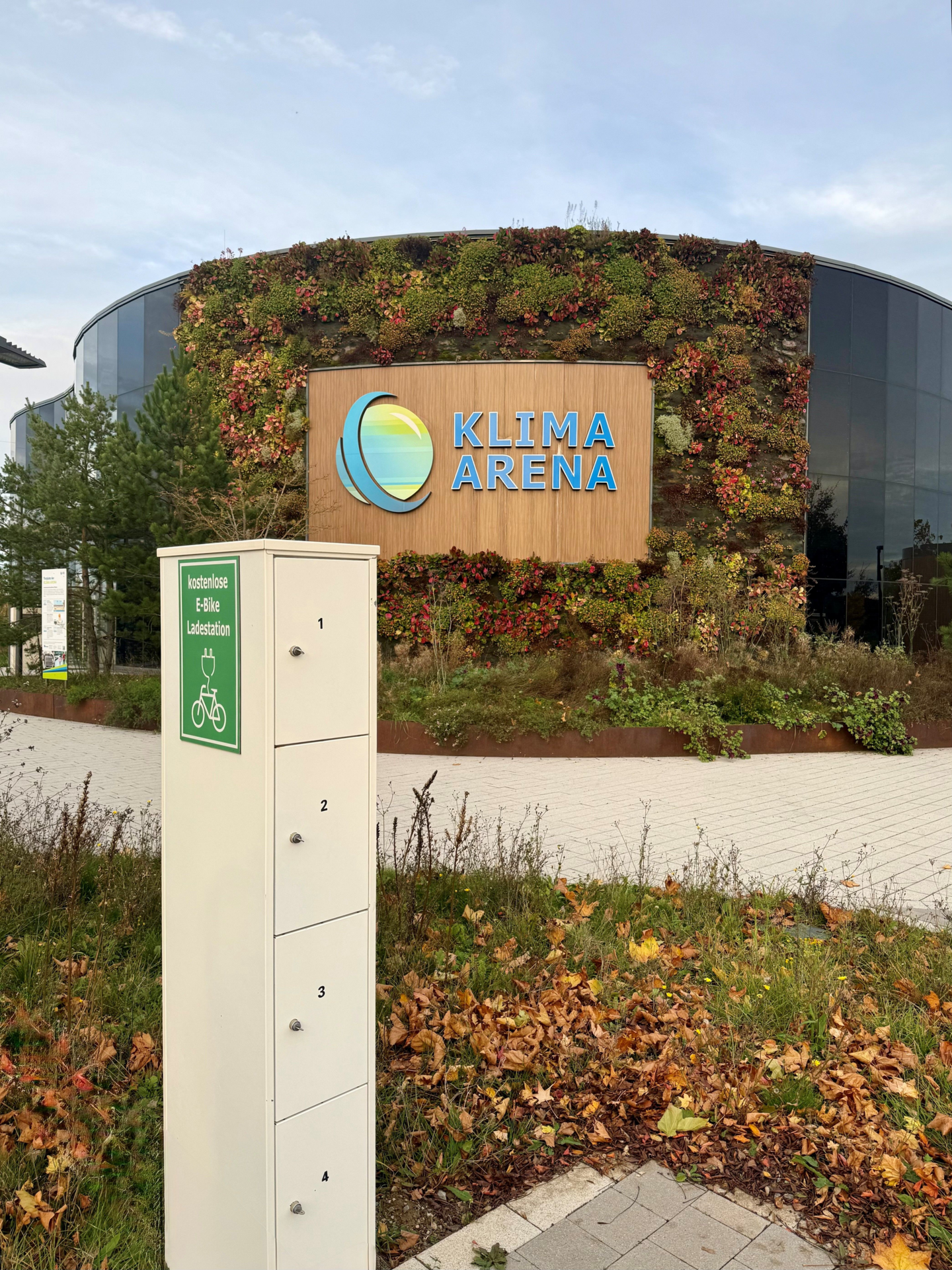 Vor dem Haupteingang der Klima Arena (linksseitig) stehen insgesamt vier kostenfreie Ladestationen zur Verfügung. Die Batterien können dort abgeschlossen werden. Während des Ladevorgangs können die Radfahrerinnen und Radfahrer gemütlich einen Kaffee trinken oder die Ausstellung besuchen.
