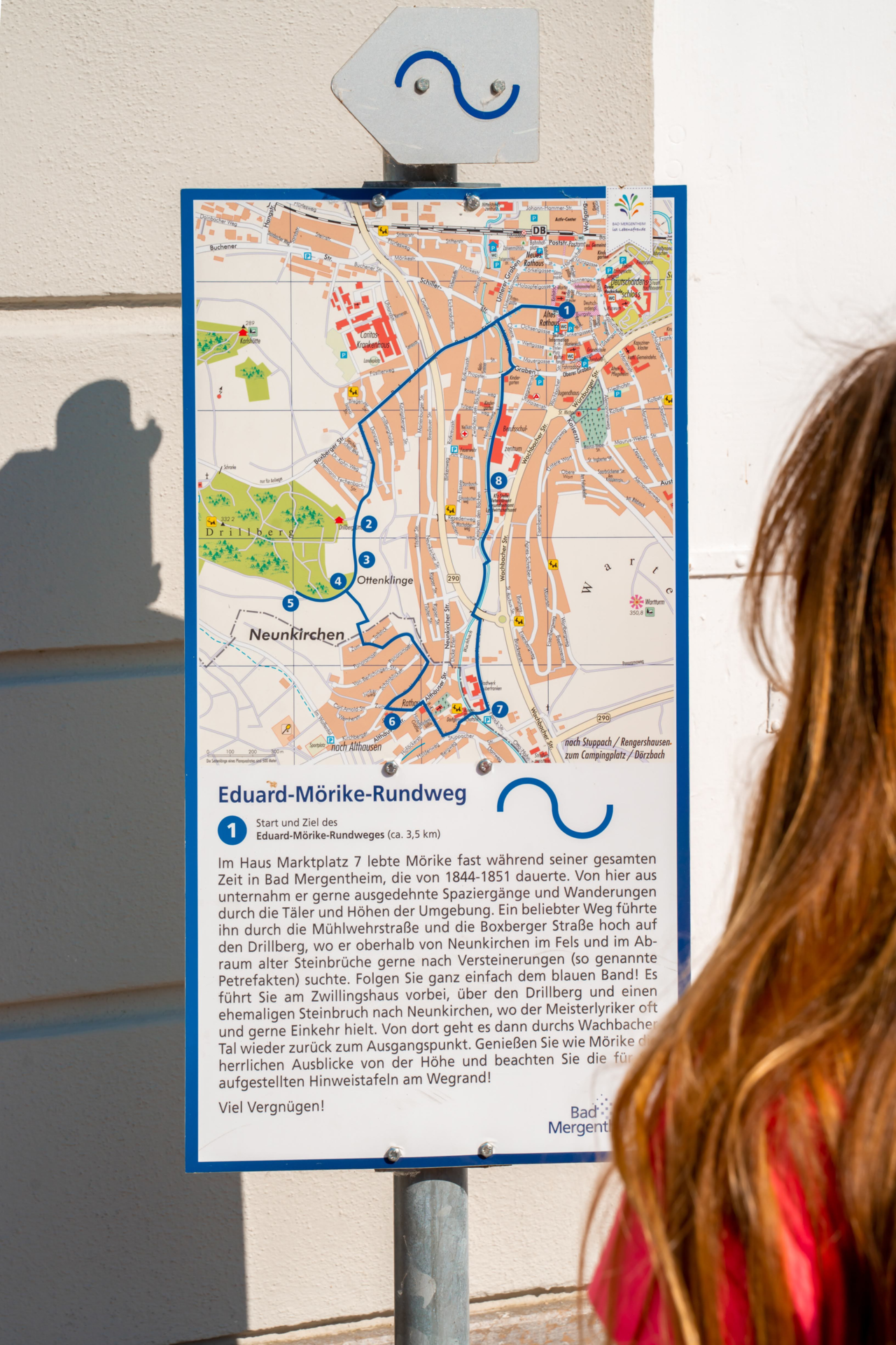 Start und Ziel des Rundweges ist der Marktplatz. Im Haus Marktplatz 7 lebte Mörike fast während seiner gesamten Zeit in Bad Mergentheim. Von hier aus unternahm er ausgedehnte Spaziergänge und Wanderungen in die Umgebung. Folgen Sie einfach dem blauen Band mit seinen acht Informationstafeln.