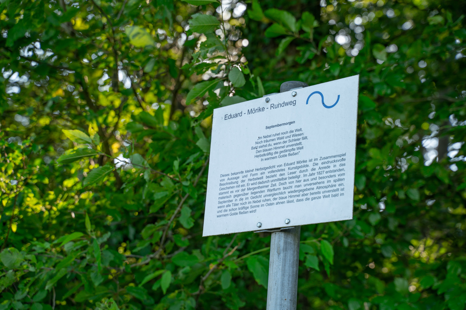 Die Straße führt uns aus dem Wohngebiet hinaus an den Waldrand. Dabei passieren wir die Stationen 2 und 3 des Weges und lassen die Poesie auf uns wirken. Bei Station 4 gehen wir weiter geradeaus und sehen vor uns links im Tal das Dorf Althausen. Das Blaue Band des Eduard- Mörike-Rundwegs weist uns am rechten Wegesrand auf einen kleinen Pfad hin, der uns durch dichtes Gebüsch zur Station 5 führt. Dort befindet sich ein alter Steinbruch, in welchem der Dichter Versteinerungen (sog. Petrefakte) sammelte.