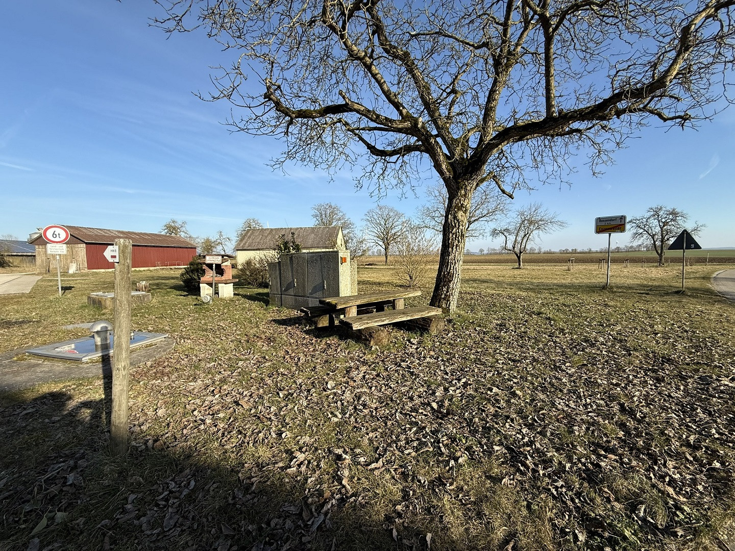 Der Picknick- und Rastplatz in Enzenweiler bietet eine einfache Sitzgelegenheit mit Tisch und zwei Bänken – ideal für eine kurze Pause.