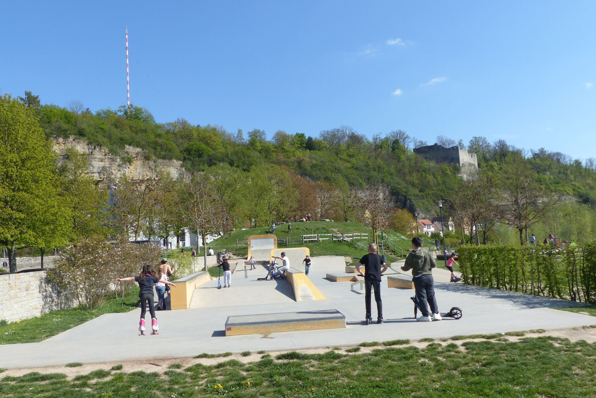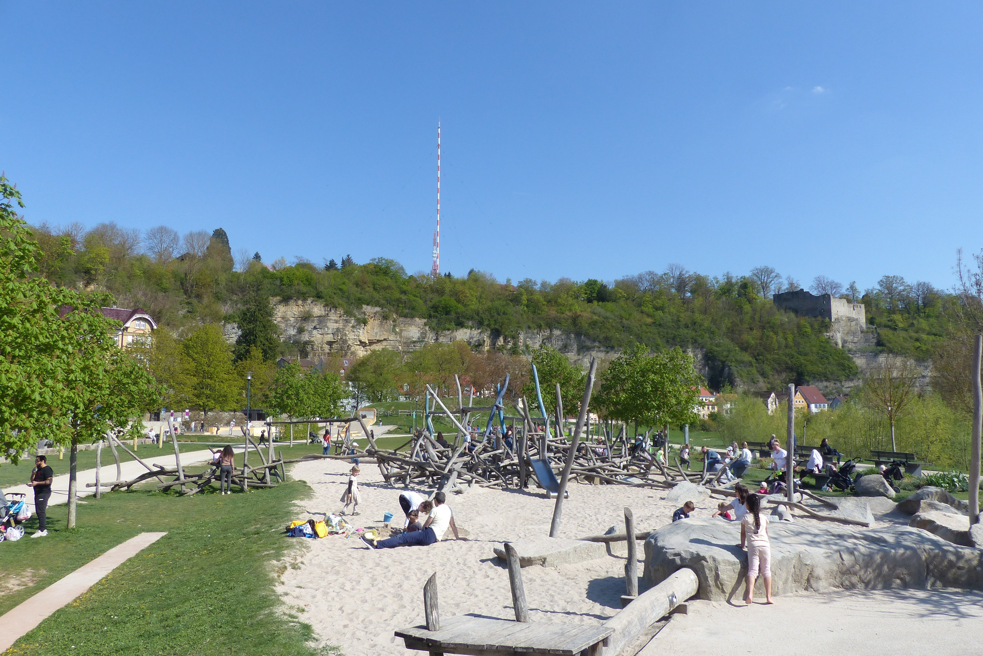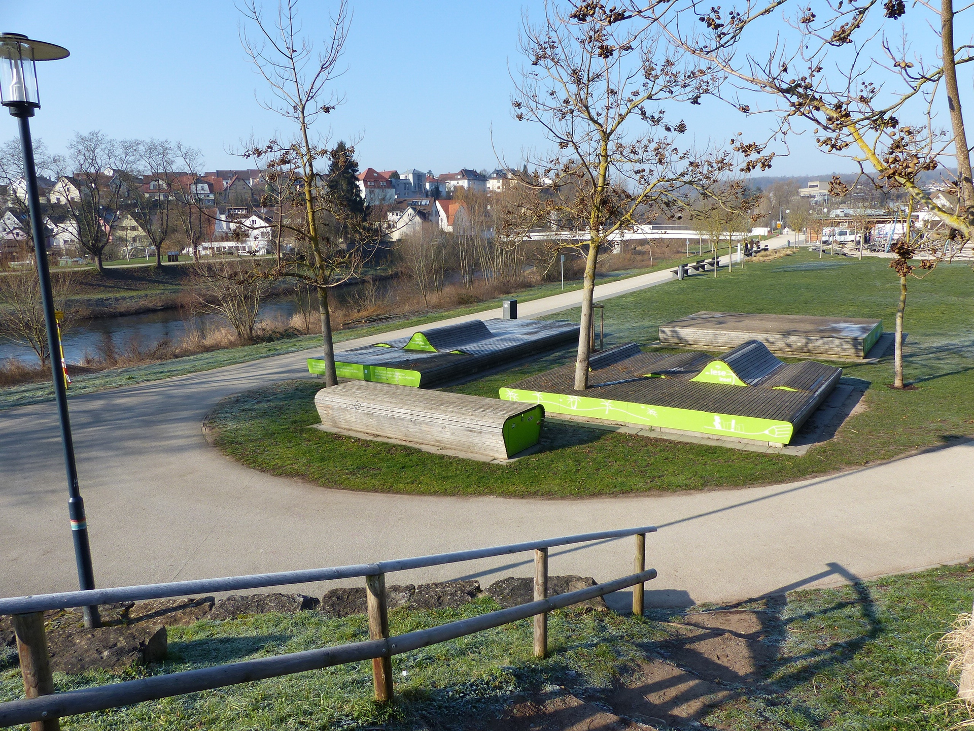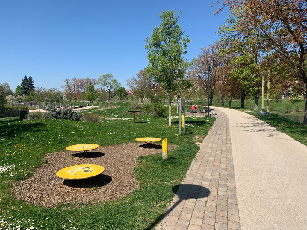 Die Gartenschau 2015 bedeutete für die rund 26.500 Einwohner-Stadt Mühlacker eine neue, zehn Hektar große grüne Mitte. Den Bürgern bietet das umgestaltete Gelände einen großen Stadtpark. Auf der urban geprägten Stadtseite entstanden ein neuer Rosengarten, ein Staudengarten, eine Pergola als Wandel- und Wellengang sowie der sieben Meter hohe Aussichtshügel, aufgeschüttet mit 5 000 Kubikmeter Aushub aus der Renaturierung der Enz. Von dort aus können Besucher die Enzlandschaft und die neuen grünen Stadträume komplett überblicken – auch einen neuen Platz Auf dem Wertle, den im Sommer Maulbeerbäume beschatten.Von der Stadtmitte kommend passieren die Mühlackerer Bürger das direkt am Eingang gelegene Bürgerforum der Bürgerstiftung Mühlacker, ein Veranstaltungs- und Treffpunkt für die Menschen. Der benachbarte Garten der Villa Bauer erinnert an den einstigen Exotengarten des Mühlenbesitzers, in dem schon Ende des 19. Jahrhunderts südliche Duftpflanzen und Bananenstauden wuchsen. Direkt nebenan pumpen 18 Düsen auf dem Fontänenplatz der Stadtwerke Mühlacker Wasserstrahlen in die Höhe. Nachts ist der Platz beleuchtet.Ortsprägend für die Dürrmenzer Seite bleibt die 80 Jahre alte Ahorn-Baumreihe am Dammweg. Landschaftstypische Trockensteinmauern überbrücken den Höhenunterschied zwischen Dammweg und den mit Holzlattenzäunen eingefassten neuen und alten Kleingärten, die von Wildobstbäumen gesäumt sind.Für die Jugend ließ die Stadt drei große Anlagen bauen. Das neue Jugendhaus, einen Spielplatz und eine Skateanlage. Auf einer Seite des Kinderspielplatzes ragt ein Nachbau der stadtbildprägenden Rundfunk-Sendemasten heraus. Auf der anderen Seite finden sich Spielbereiche mit Sand, Wasser und Schwemmholzelementen. Bei der Konzeption des 400 Quadratmeter großen Skateparks wurden – wie auch beim Spielplatz – die künftigen Nutzer in die Planungen einbezogen.