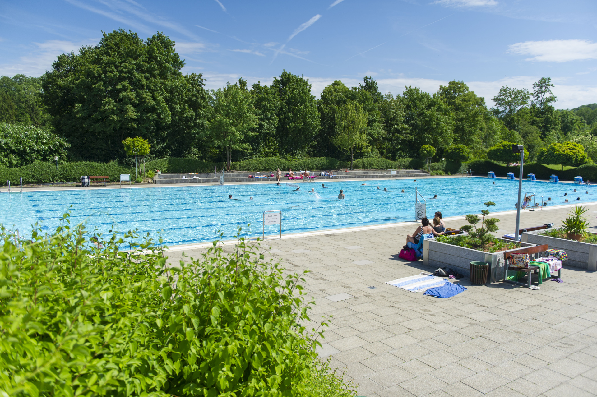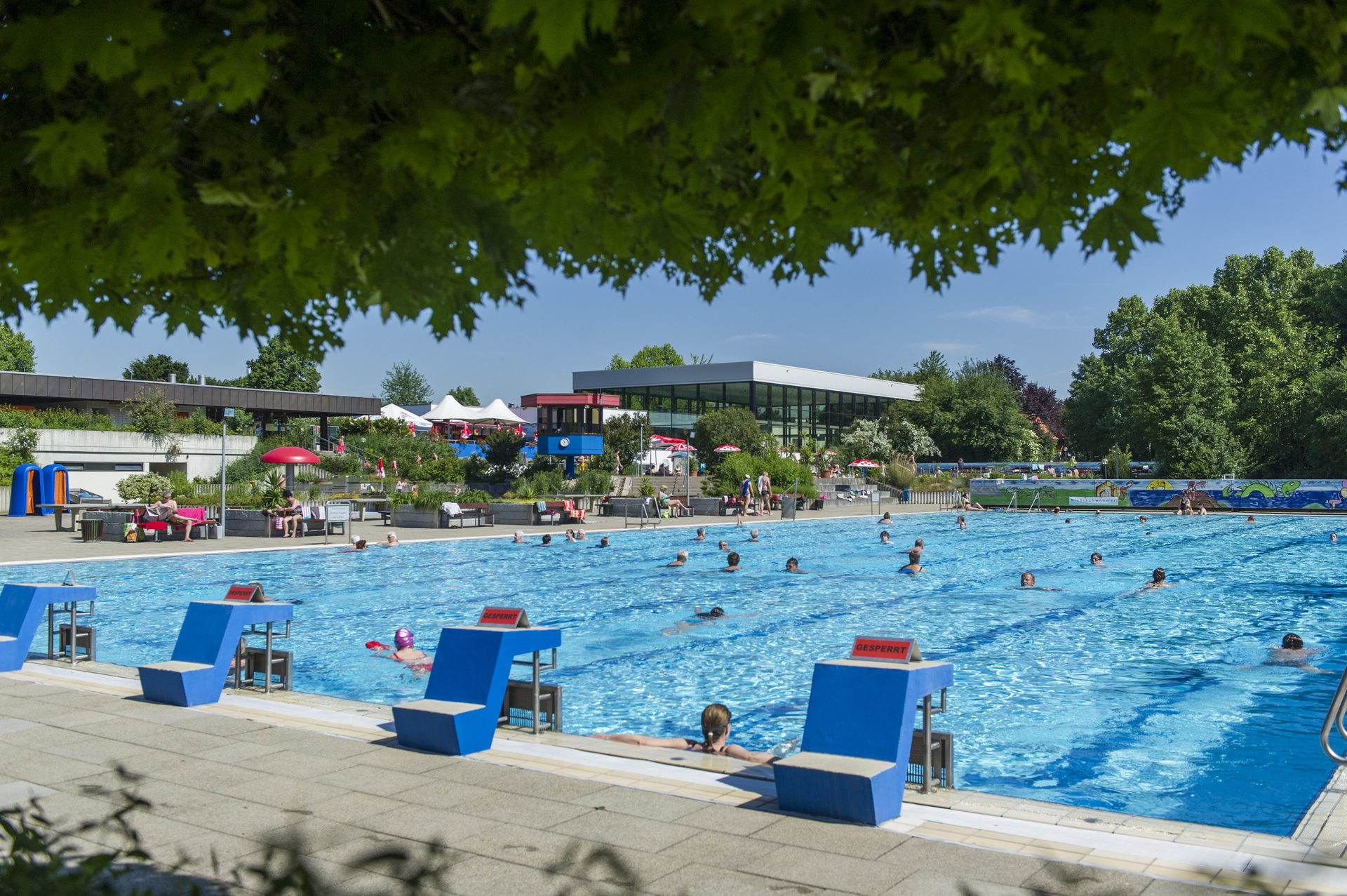 Mehrzweckbecken mit 24°C, Nichtschwimmerbecken mit 27°C, Kinderplanschbecken mit 28°C. Großer Eltern-Kind-Bereich mit Wickelmöglichkeit und Kühlschrank. Bewirtete Sonnenterasse, Bananenrutschbahn, Schach spielen, Tischtennis-Match, Beach-Volleyball. 200 Fahrrad- und 500 Auto- Parkplätze.