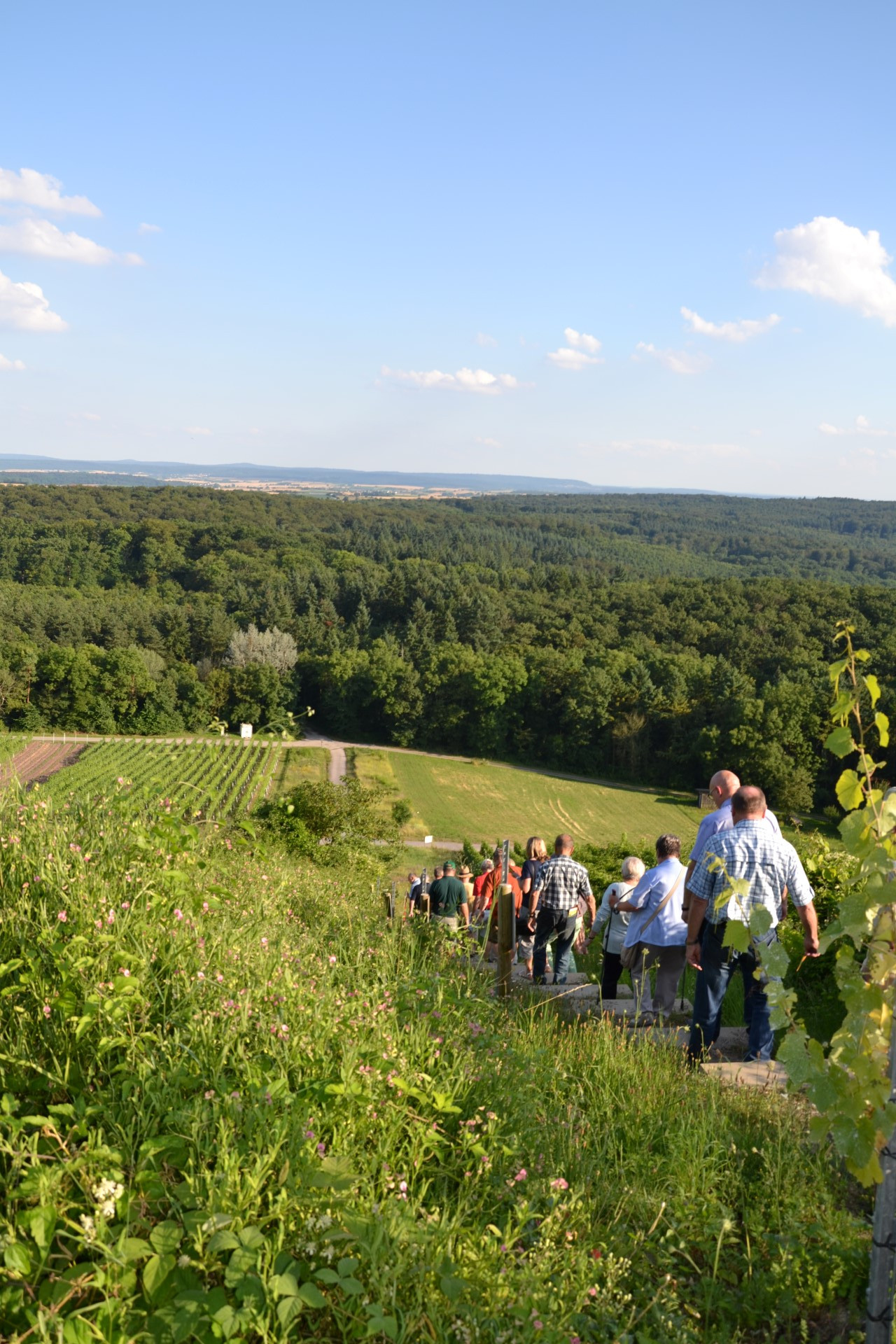 Eine Gruppe Menschen wandert auf einem Weinberg des Hilsbacher Eichelberg im Grünen | © Stadt Sinsheim