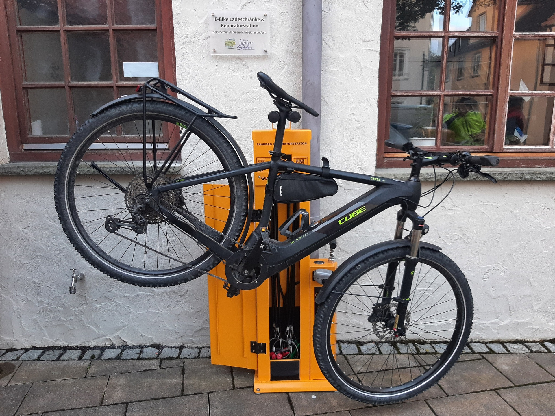 Das Kleinprojekt Reparaturstation wurde mit dem Förderprogramm "Regionalbudget" der Allianz Fränkischer Süden gefördert. Die Servicestation befindet sich vor dem Bürgerbüro. Direkt neben den E-Bike-Ladeschränken finden Sie eine Raparaturstation für Fahrräder. Hier können kleine Fahrradreparaturen von Ihnen selbst in die Hand genommen werden.