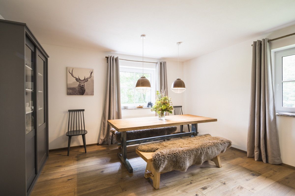 Auf 160 m² Wohn- und Nutzfläche mit großzügigem Wohn-Essbereich und Landhausküche mit Zugang auf die Terrasse, zwei Schlafzimmern, einem Alkovenbett und zwei Badezimmern wurde ein sehr gemütliches und ganz besonderes Chalet für bis zu sechs Gäste geschaffen.