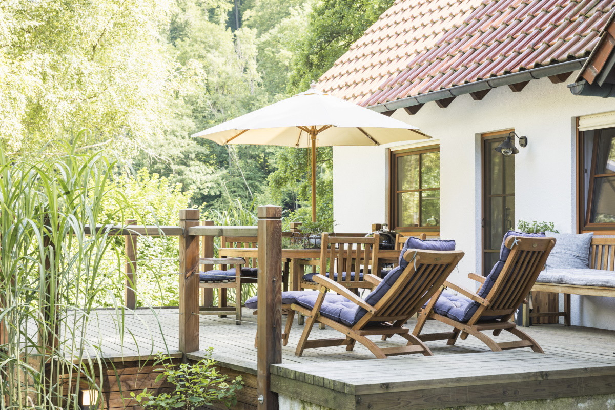 Von der Terrasse im eigenem Park auf 7.000 m² schweift der Blick über Weiden und Wiesen oberhalb der Brettach (Nebenfluss der Jagst). Hier hast du einen direkten Zugang zur Brettach und einen kleinen Privat-Wanderweg entlang eines Baches gesäumt von Vieh - und Pferdeweiden.