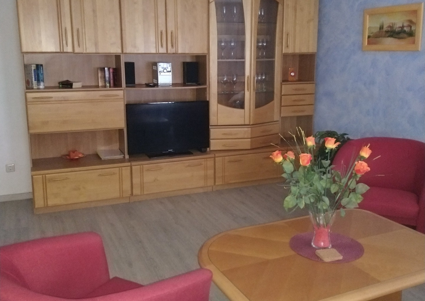 In der Küche sind Geschirr, Bestecke und Gläser in ausreichender Zahl vorhanden.