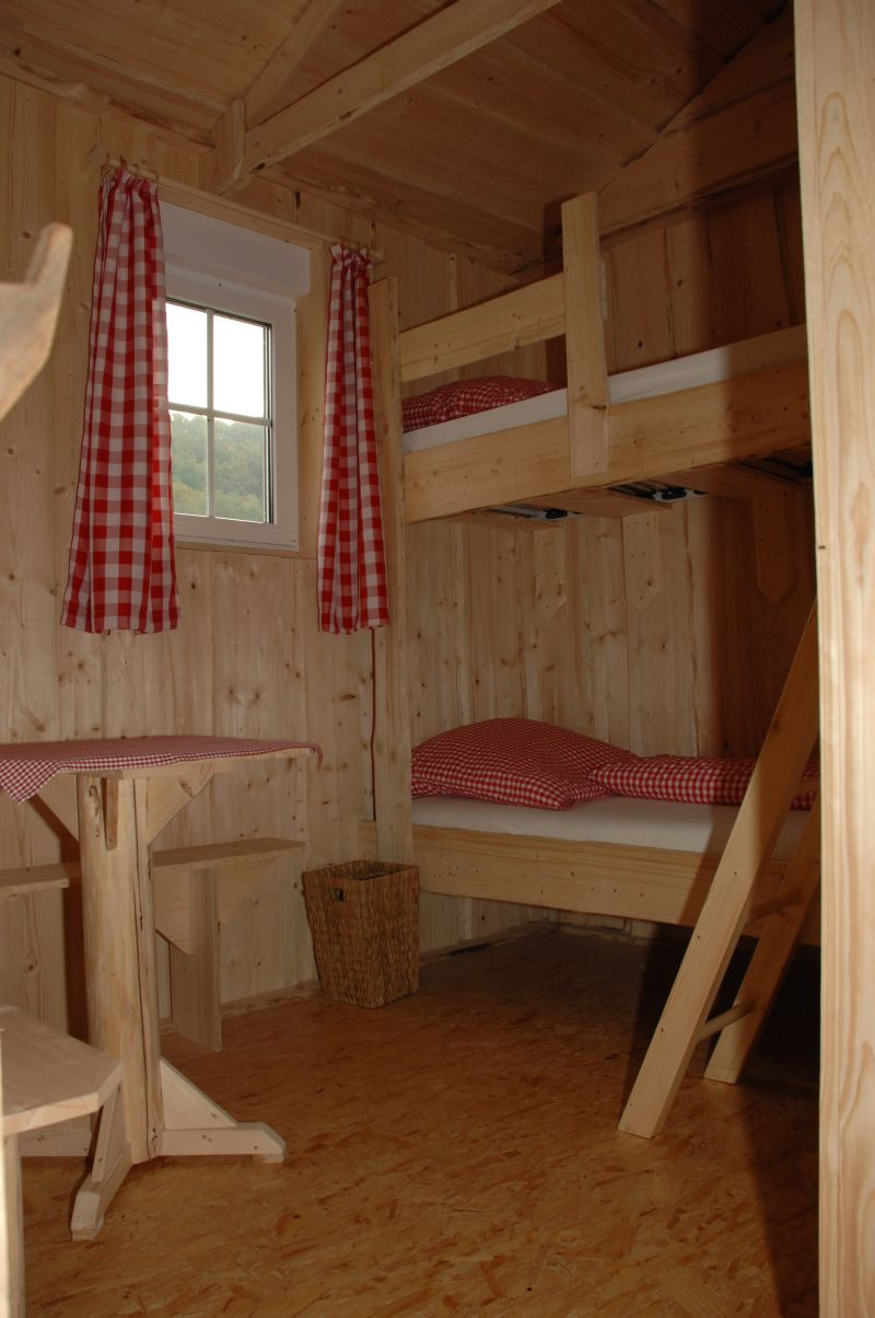 Abenteuerliches Übernachten ist in fünf Radlerkojen möglich. In der ehemaligen Scheune wurden die Abenteuerhütten mit jeweils zwei Stockbetten und einer gemütlichen Sitzecke gebaut. Dusche und WC stehen für alle gemeinsam zur Verfügung. Ideal für dich als Radfahrer bei einem Zwischenstopp.