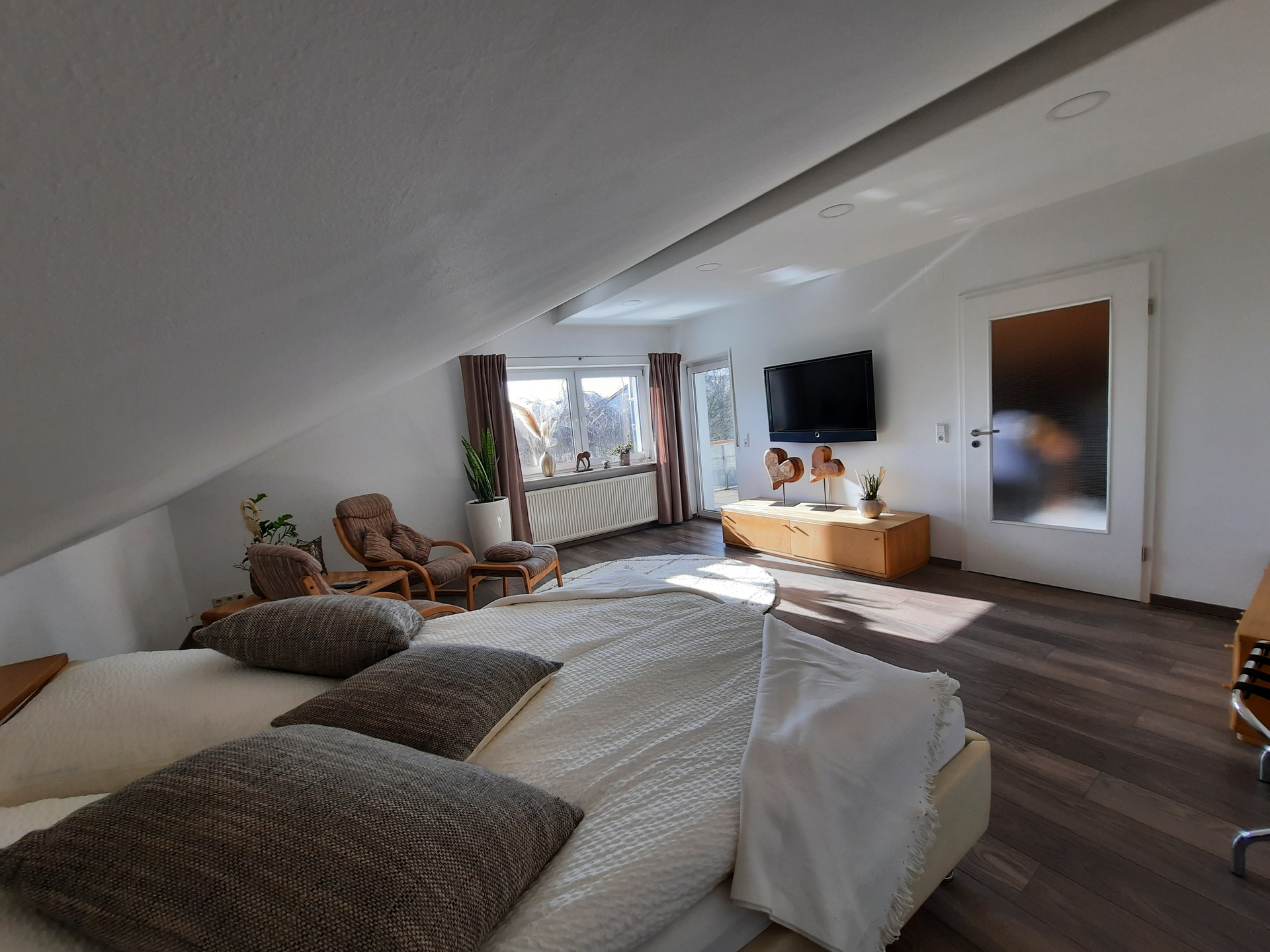 Die Ferienwohnung mit 85 qm verfügt über zwei Schlafzimmer mit je einem Doppelbett, zwei Flachbildschirmen, einer Sitzgelegenheit, einer voll ausgestatteten Küche mit Backofen, Herd, Kühlschrank, Spülmaschine, Kaffeemaschine und Kochutensilien sowie einem Bad mit Dusche und Badewanne, Gäste- WC und einer Diele mit Garderobe. Für unsere kleinen Gäste gibt es einen Spiele- und Bücherschrank. Vom Balkon können Sie die Ruhe und Aussicht genießen mit einem Weitblick auf Eppingen.