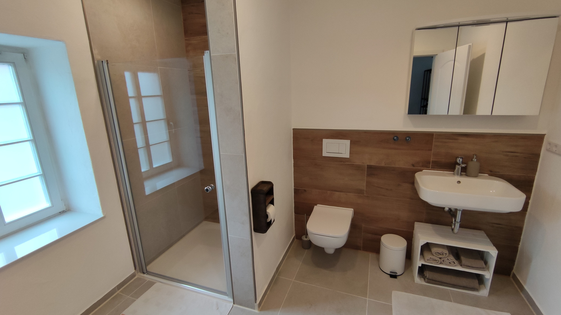 Die Wohnung bietet neben einer modernen Küche, einem Tageslicht-Bad mit Dusche, einem Doppelbett und einem Schlafsofa auch einen gemütlichen Gewölbekeller.
