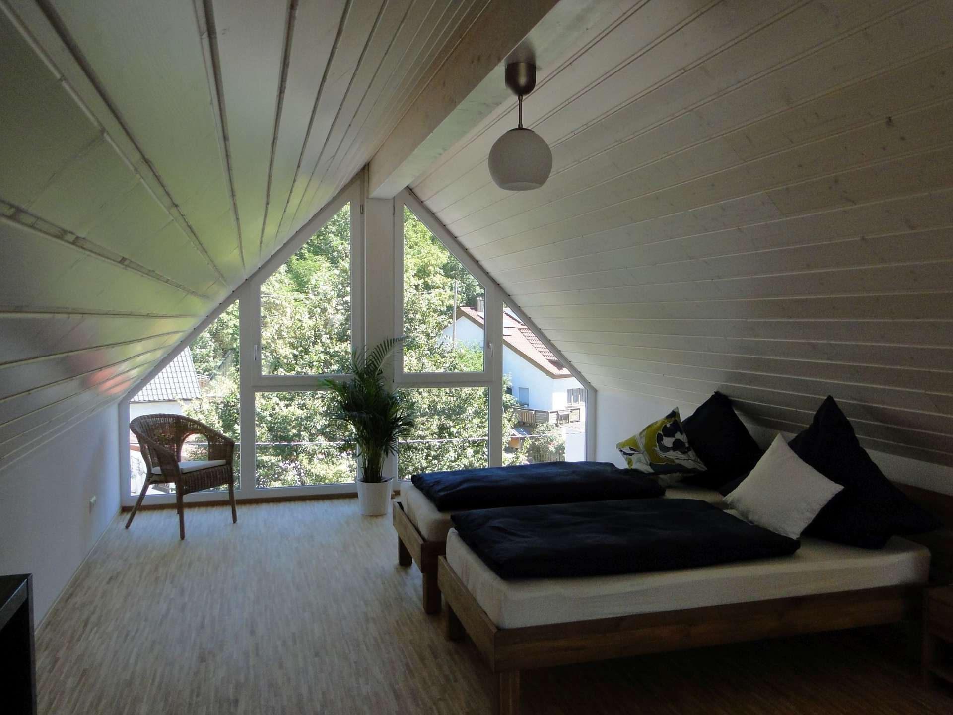 Zimmer Ferienwohnung mit Betten und Stuhl und einer dreieckigen Fensterfront | © Neckar-Zaber-Tourismus e.V.