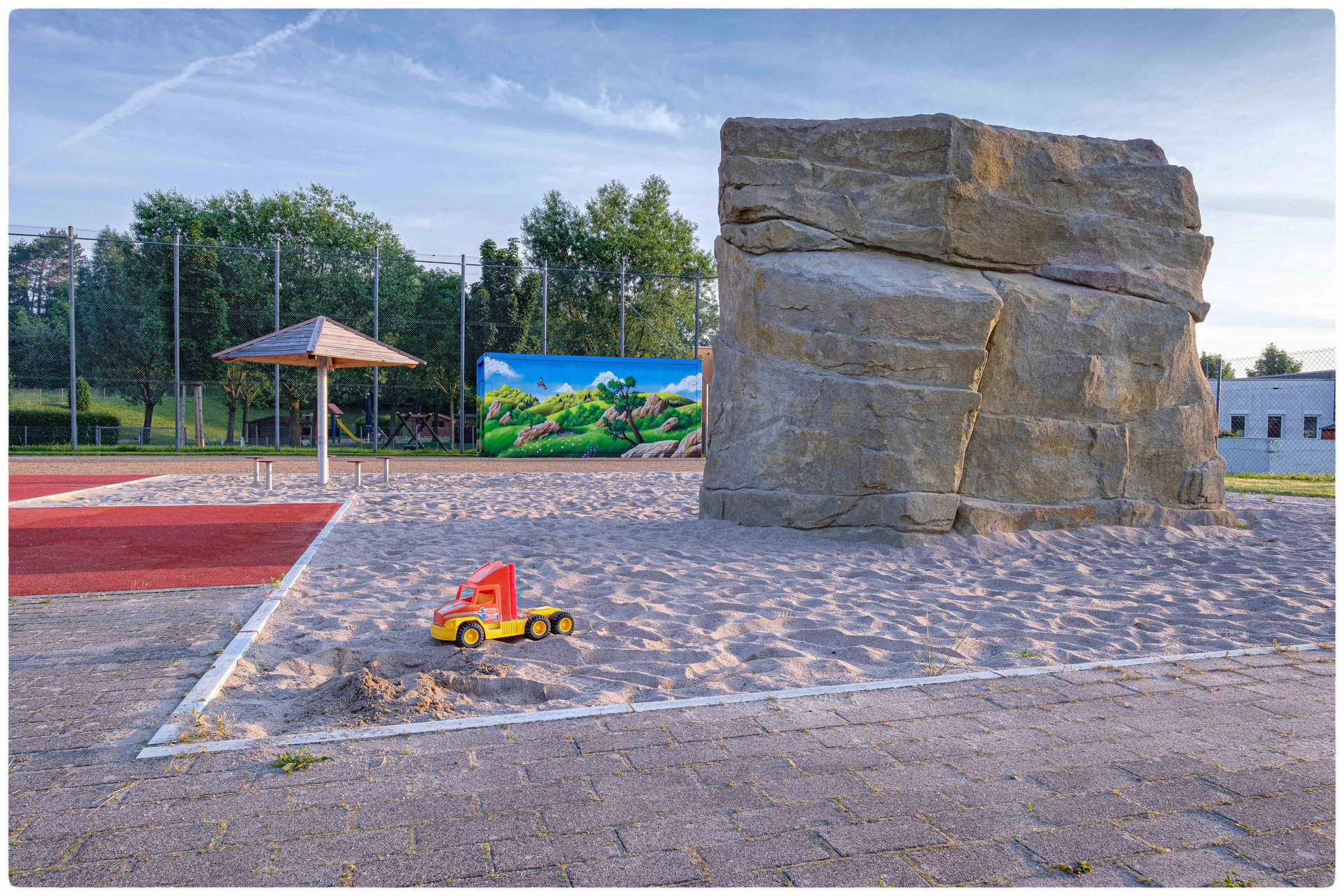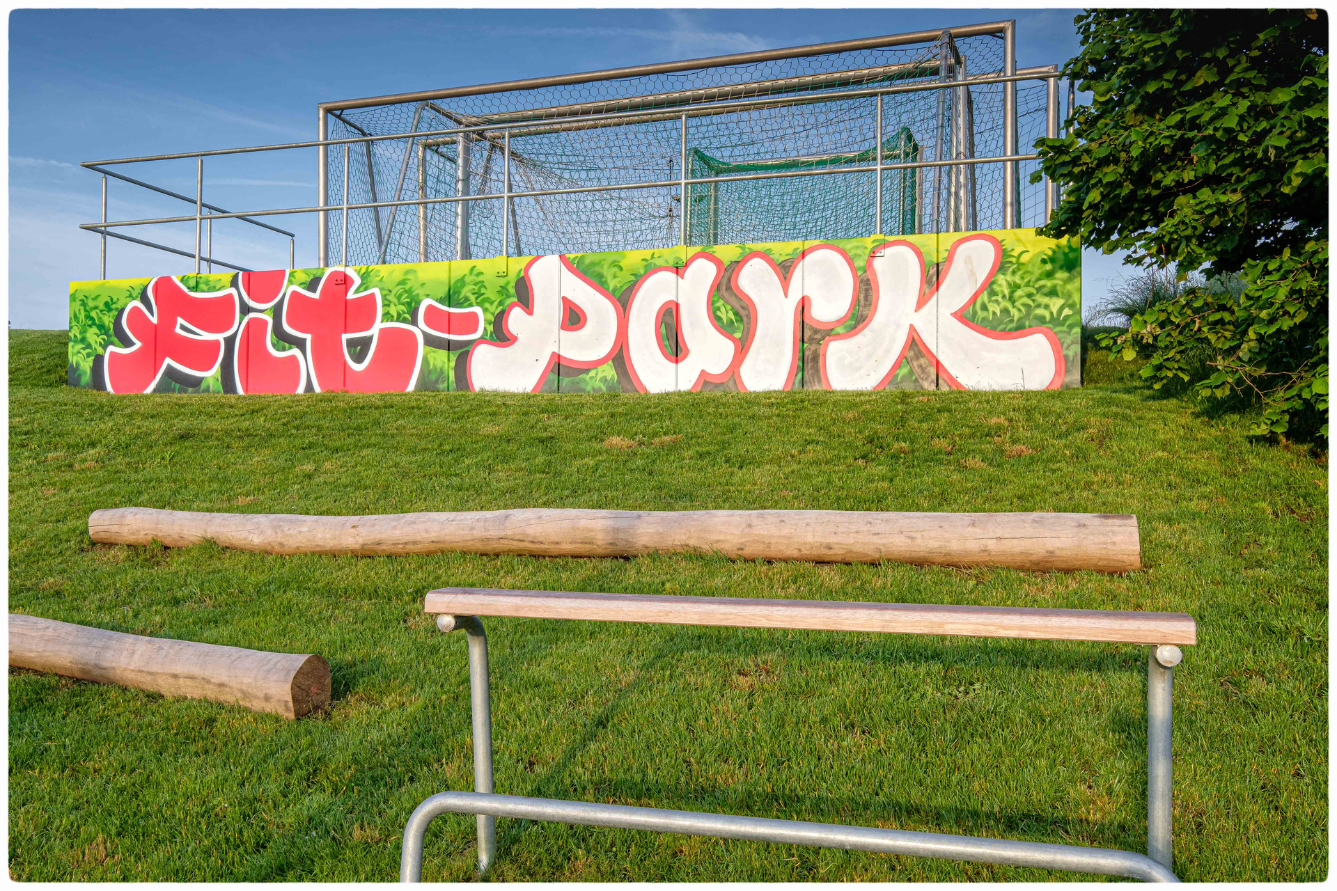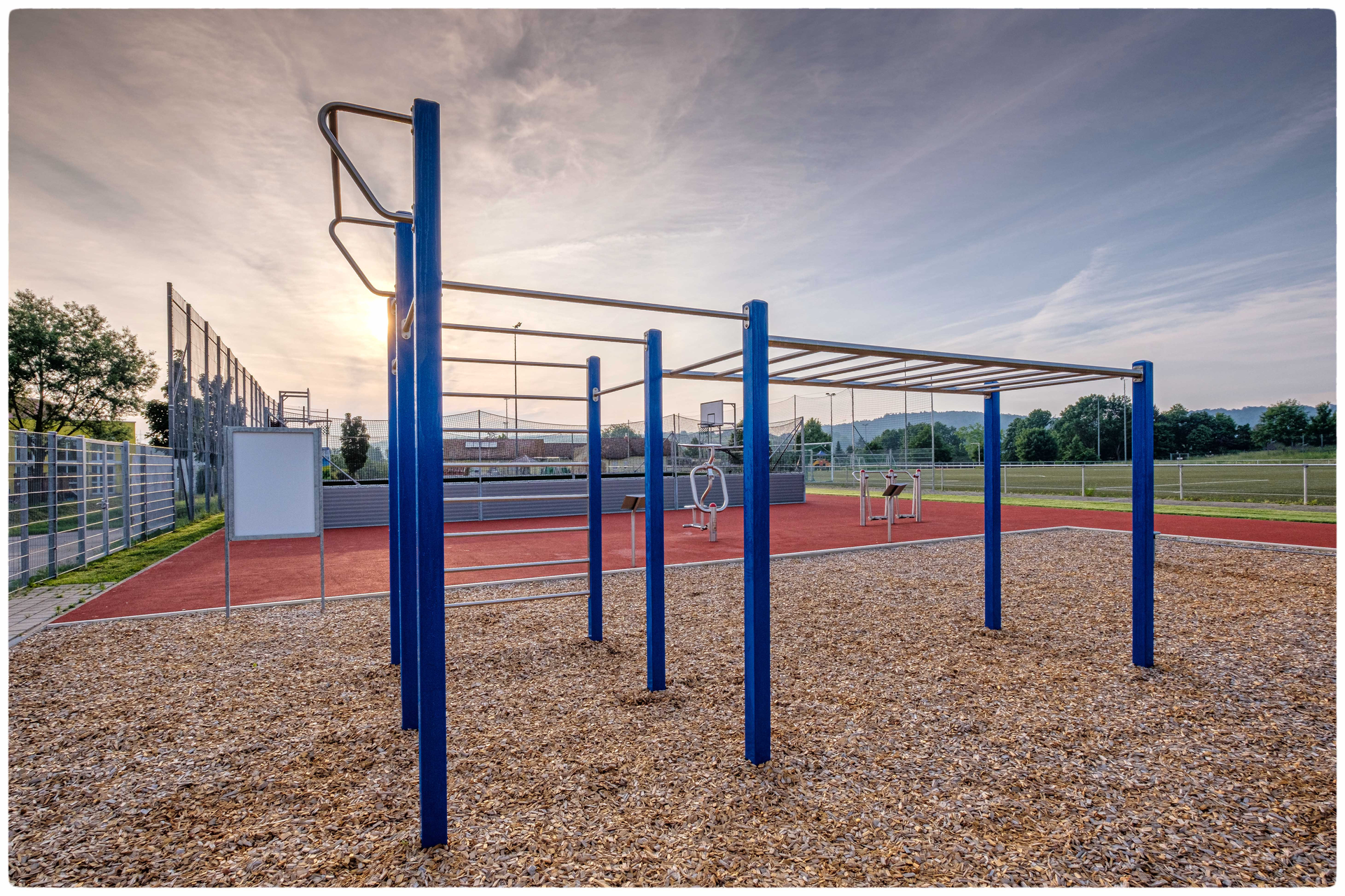 Darüber hinaus befinden sich auf dem Fit-Park Calisthenics-Geräte, ein Klettergerüst, Trampolin und ein Kletterfelsen.