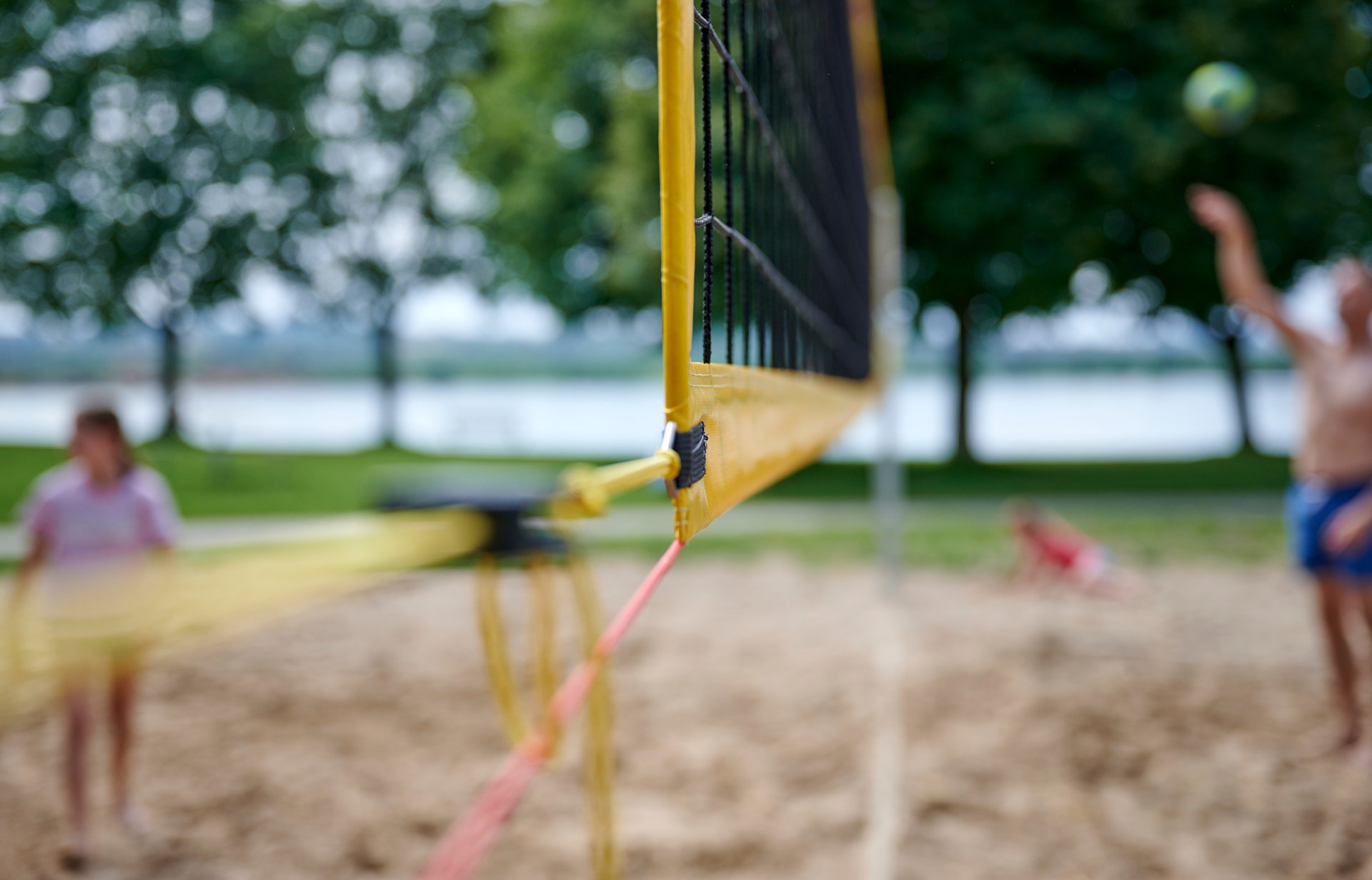 Die Freizeitanlage ist durch die Spiel- und Liegewiesen geprägt. Sie sind dem Verlauf der Landschaft angepasst und laden mit vielen schattenspendenden Bäumen und Ruhebänken zum Spielen und Relaxen ein. Für sportliche Action stehen ein Beachvolleyballfeld mit weichem Feinsand und ein großer Skatepark mit Quaterpipe, Table, Ramp und Bank bereit. Zahlreiche Tischtennisplatten sowie Großspielfelder für Mühle/Dame und Schach runden unser Angebot ab.