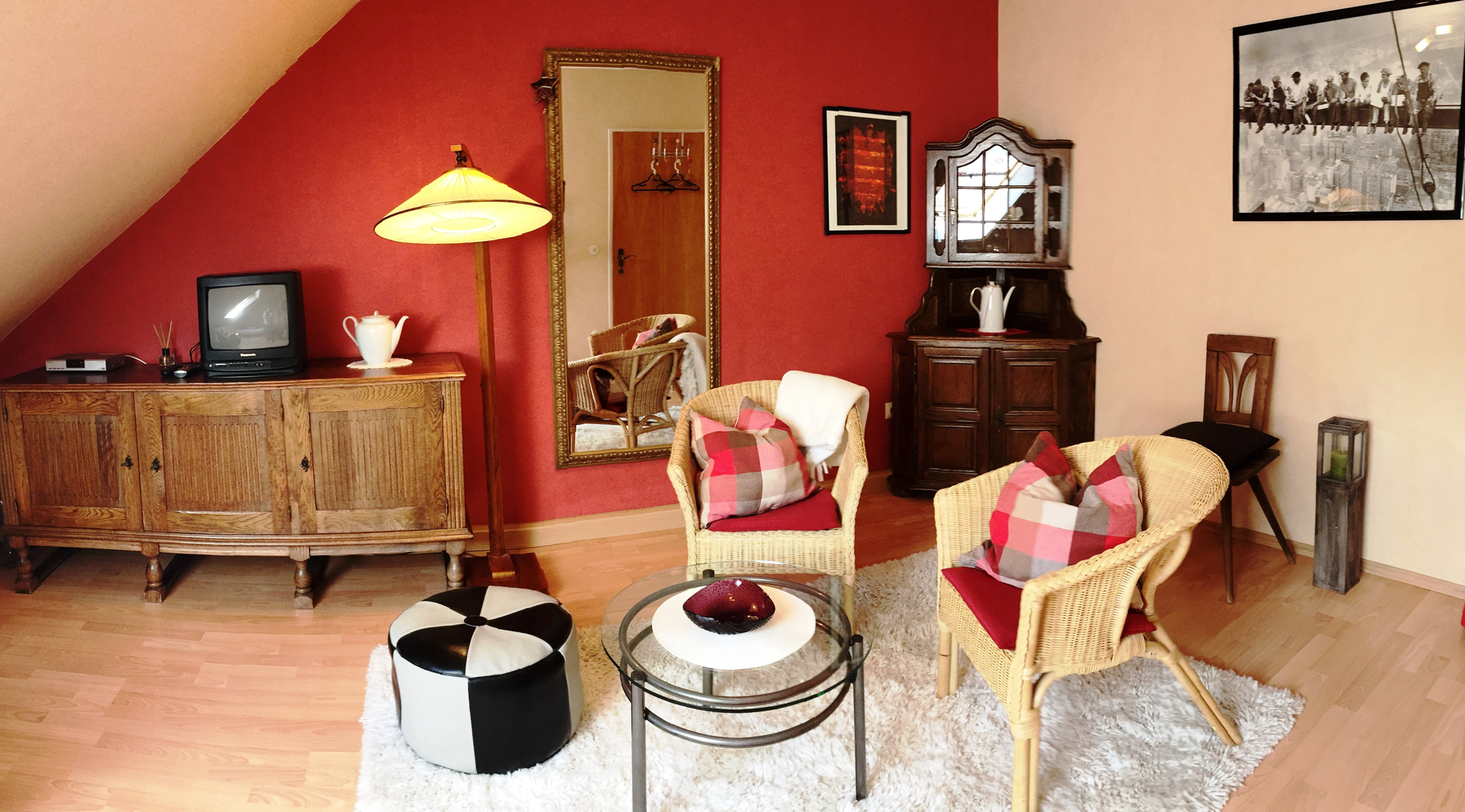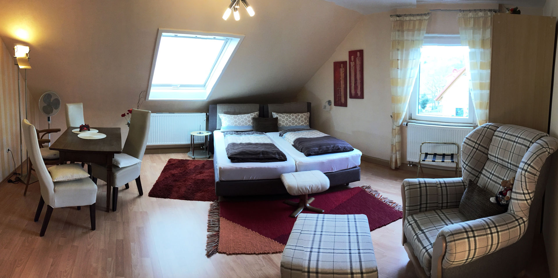 Zimmer 1 Wohn-/Schlafzimmer mit Doppelbett 1,90 m x 2,00 m, Kleiderschrank, Sessel, Essgruppe mit vier Stühlen, SAT-TV