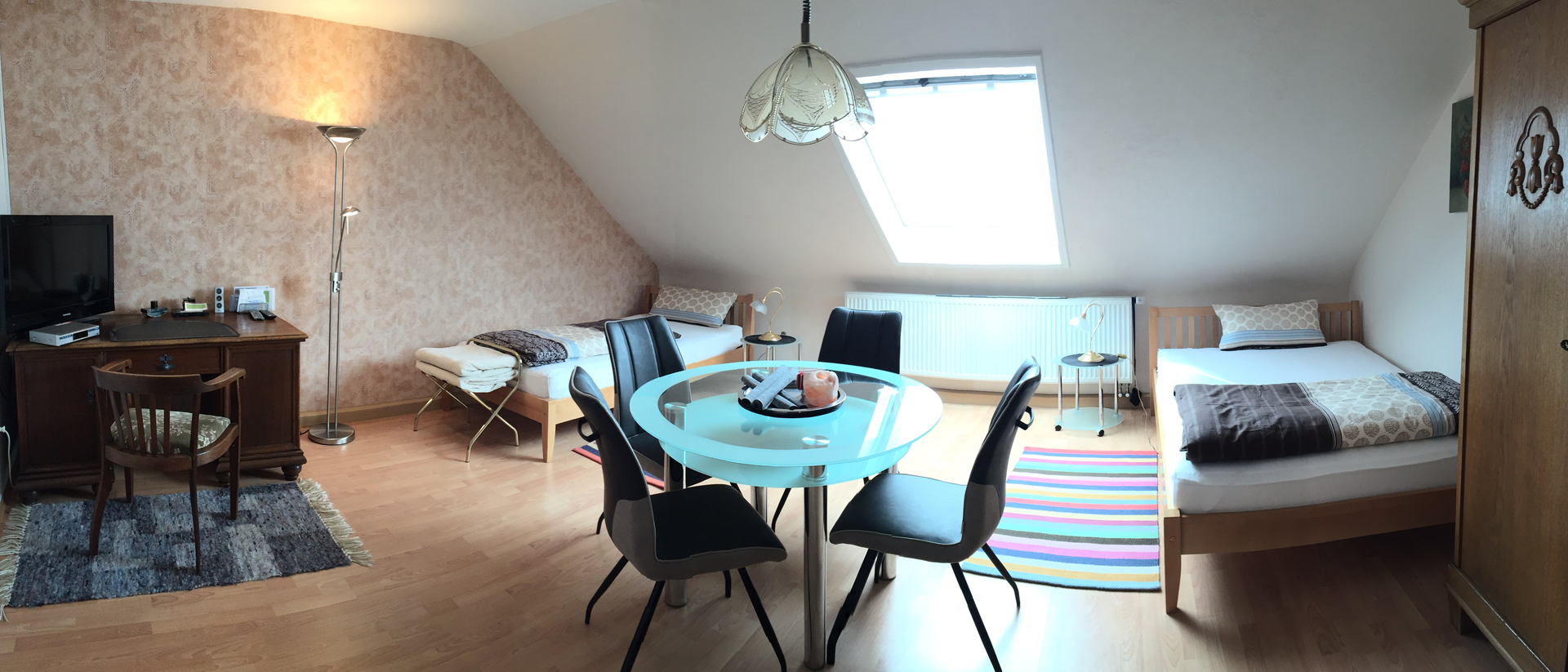 Zimmer 2 Wohn-/Schlafzimmer mit 2 Einzelbetten, Kleiderschrank, Schreibtisch, Essgruppe mit vier Stühlen, SAT-TV