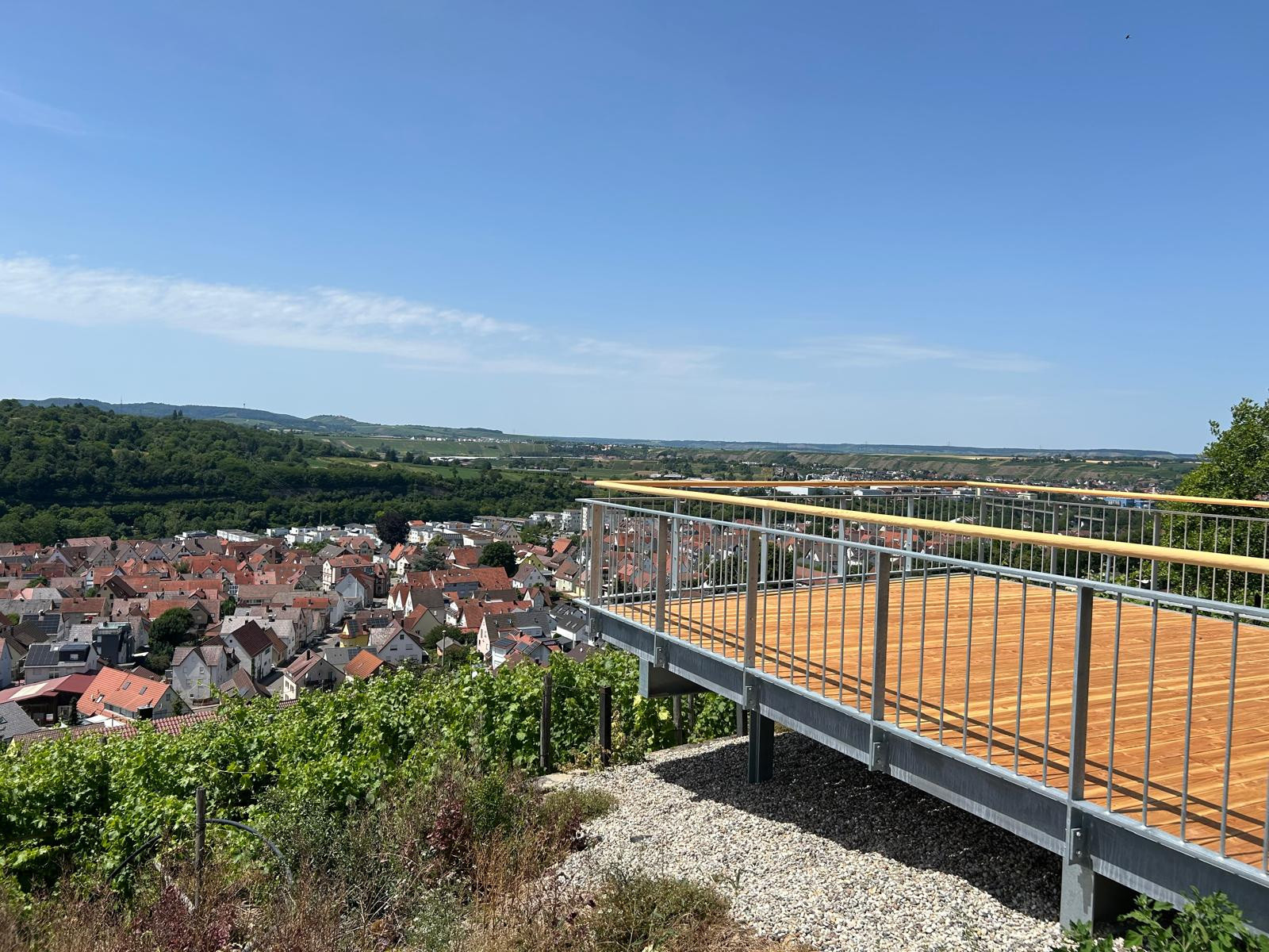 Seit dem Sommer 2025 kannst du unsere Steillagen hautnah erleben. Du stehst oberhalb der Weinberge am Genussplatz im Forst und hast einen herrlichen Ausblick über Gemmrigheim und die nähere Umgebung.