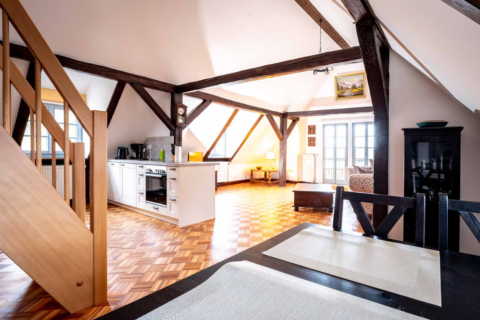 Urlaub im Schloss! Unsere im Jahr 2015 neu eingerichteten Ferienwohnungen befinden sich im Dachgeschoss des historischen Geyer-Schlosses aus dem Jahr 1587.