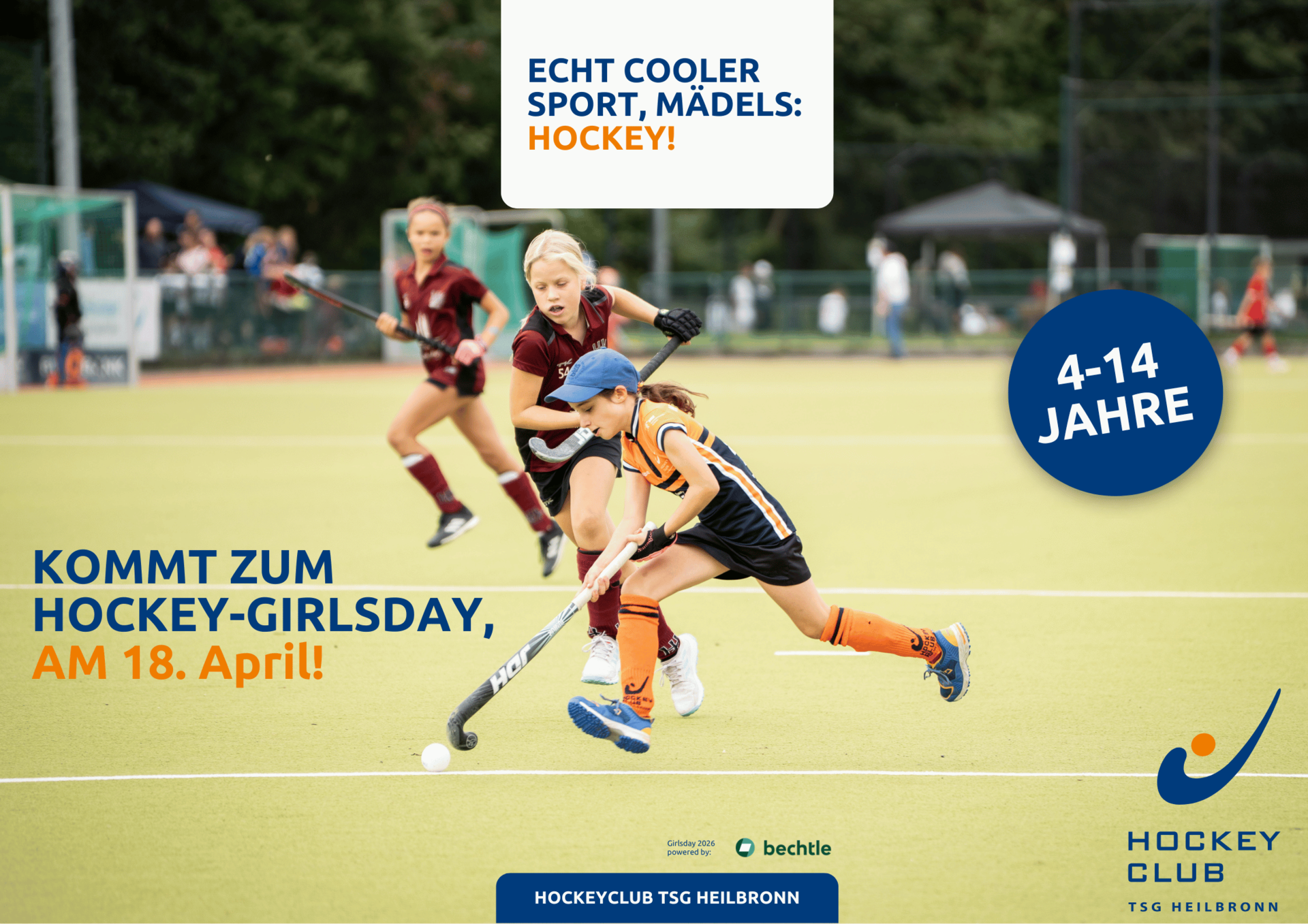 Du hast Lust, die Sportart Hockey mal auszuprobieren? Du bist sportlich und hast Lust auf Neues? Dann bist du herzlich eingeladen zu unserem großen Girlsday. Wir bieten allen Mädels von 4 bis 14 Jahren einen tollen Hockey-Testtag an. Hier kannst du zum Hockeyschläger greifen und einfach testen. Bring gerne deine Freundin(nen) mit, je mehr mitmachen, desto mehr Spaß werden wir haben!